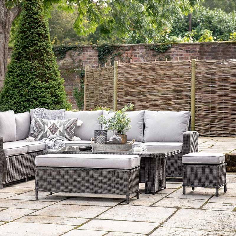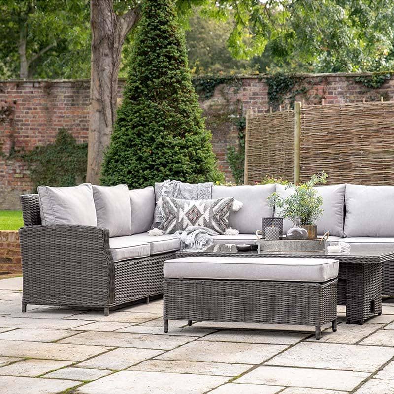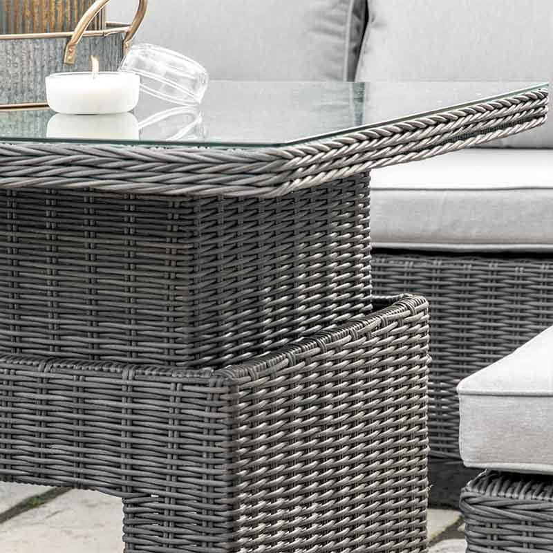 Get ready for some stylish alfresco dining and lounging with this multifunctional rattan outdoor furniture set. Available in a washed grey or neutral colour, the Alum Bay grey rattan garden furniture set features a garden corner sofa, together with a rattan outdoor bench seat and matching stool offering plenty of flexible seating options for entertaining. But it is the outdoor coffee table that brings innovation and flexibility to the garden with its clever rising mechanism that can take it from a lounge table to an outside dining table and chair set in an instance. Made from handwoven PE rattan and powder-coated aluminium frames the collection also has comfort in mind with premium showerproof seat and back cushions available in the same colourway as your chosen rattan furniture. For contemporary garden furniture that combines style and function, the Alum Bay rattan garden furniture set will help you create an outdoor haven.