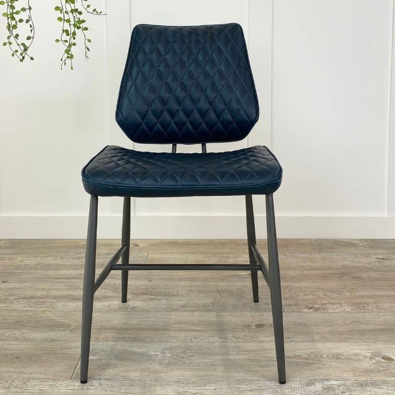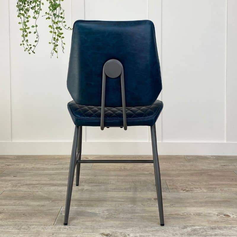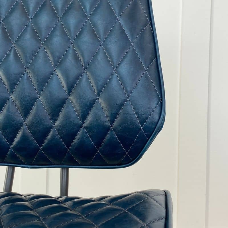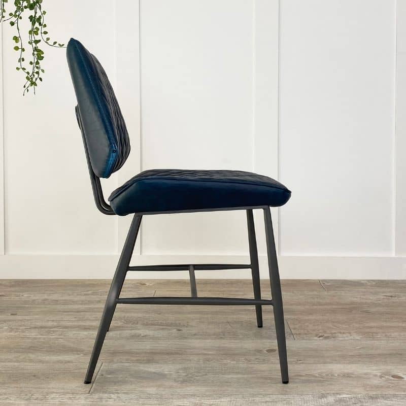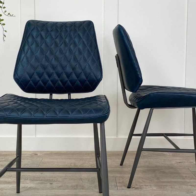 Retro dining room chairs are always special and never fail to add an air of cool sophistication to the room. The beguiling Archie Blue Faux Leather Dining Chairs offer a pleasing contrast between the rich, deep colours of the PU leather and the dark steel frame, with its curved seat-back offering total comfort. These are must-have vegan leather dining chairs, especially if you like a little extra support which is added by the sturdy cross framing. In the dining room or the boardroom, these 100% sumptuous PU chairs can help make every occasion a special one. Also available in dark brown.