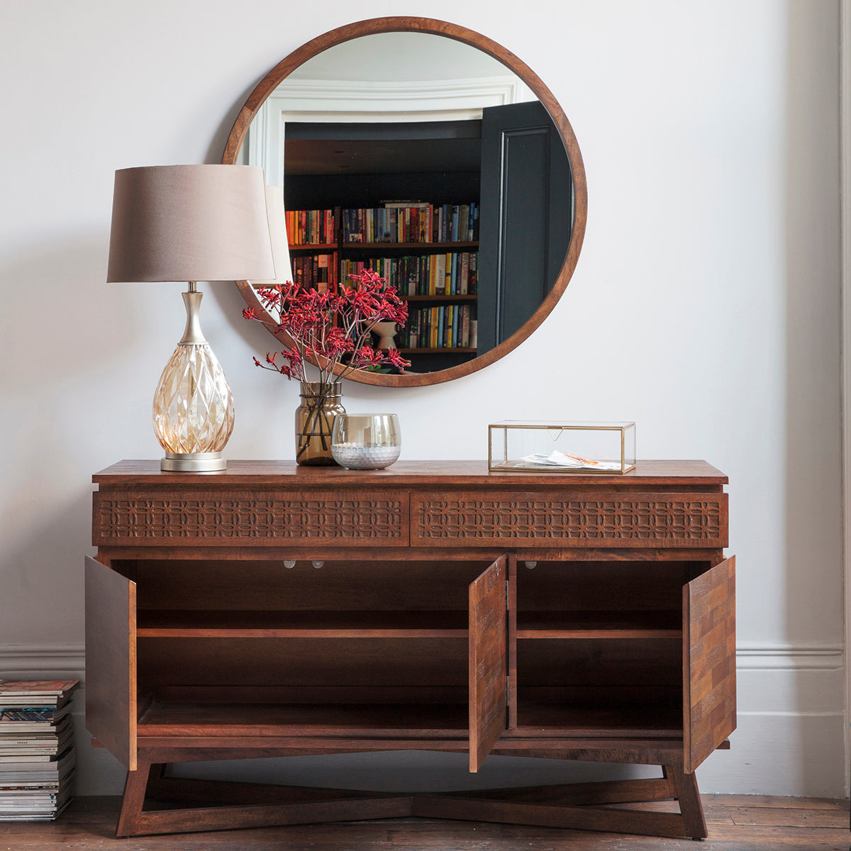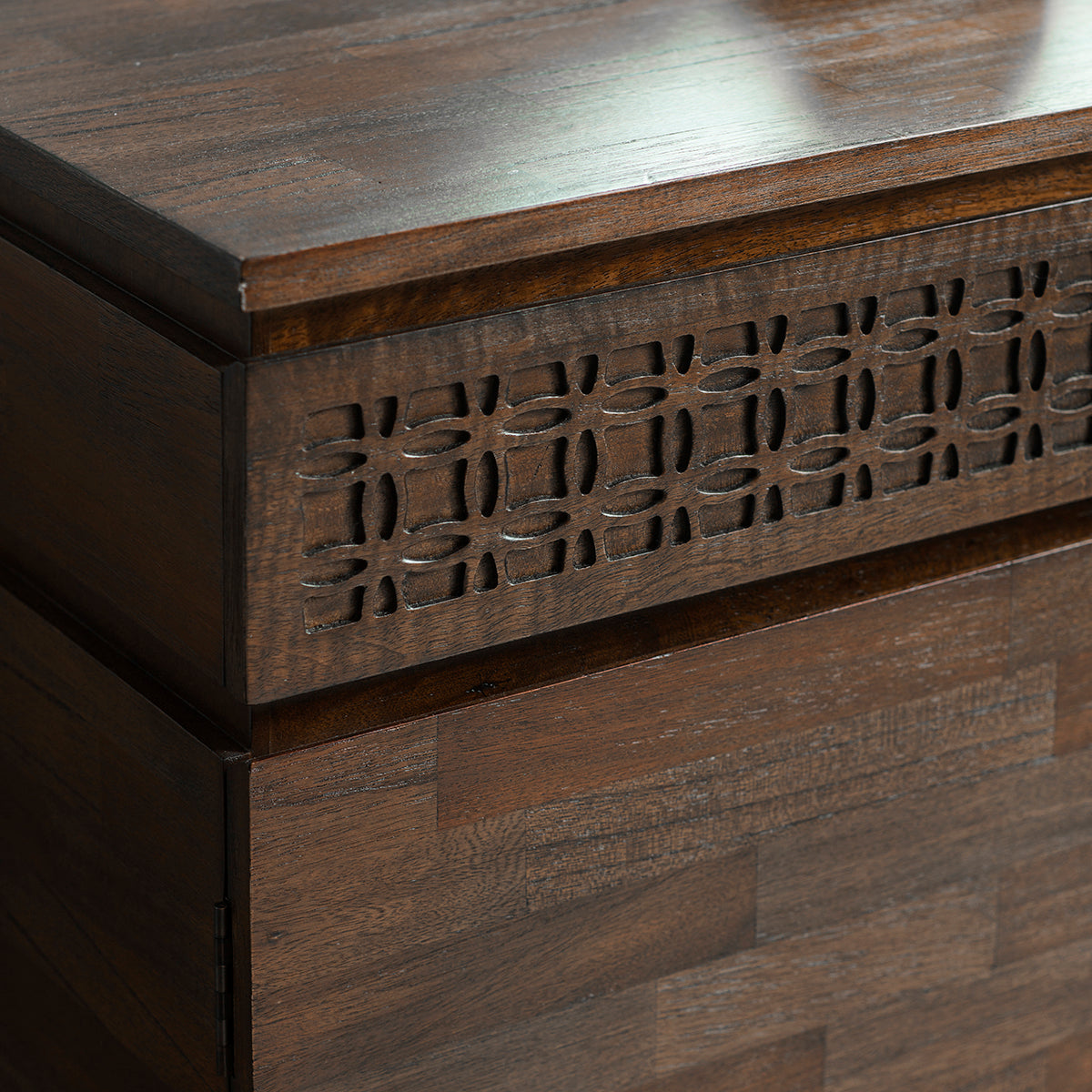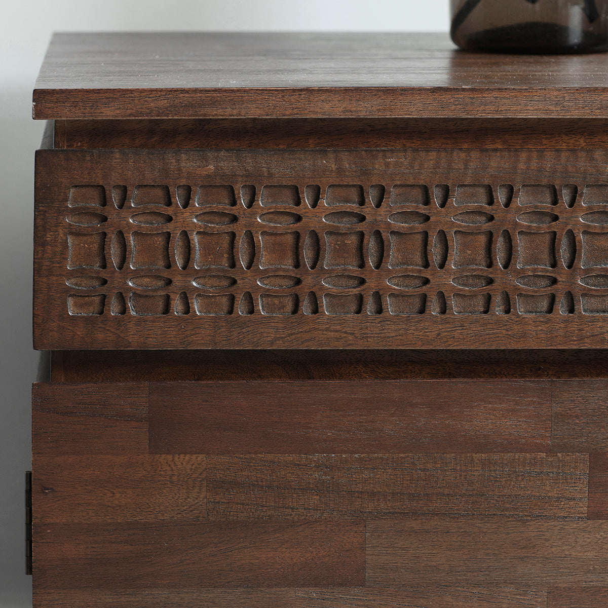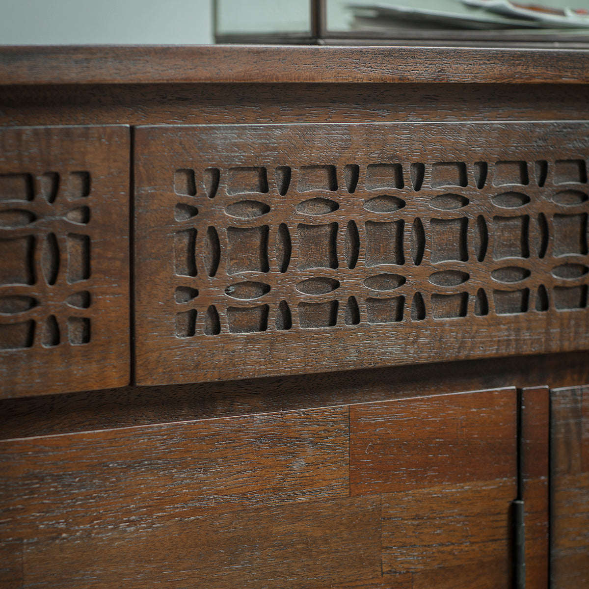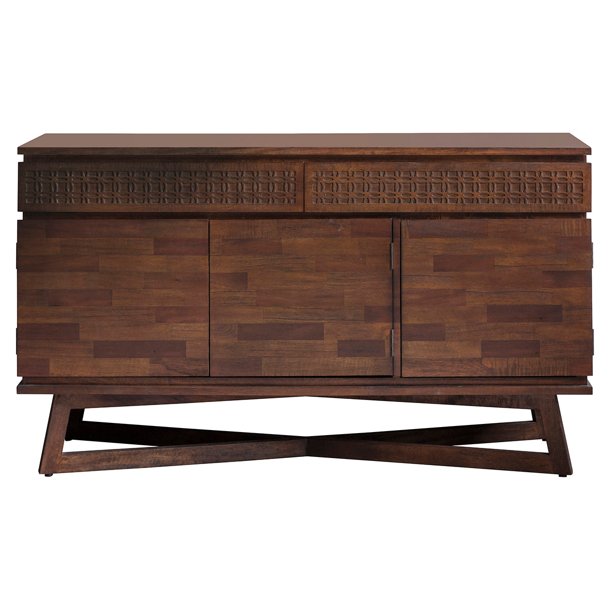Beyond its aesthetic appeal, this sideboard boasts a unique inlaid pattern on its surface, a nod to its global traveller inspiration infused with ethnic design nuances. The spacious compartments provide ample storage, making it as functional as it is beautiful.