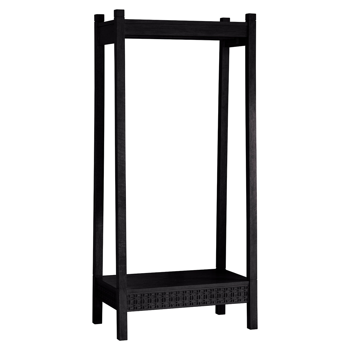 Functionality meets style in this open wardrobe. Its sleek vertical design is complemented by a spacious lower shelf adorned with intricate patterns, providing additional storage or display space. The robust hanging rod is designed to hold a range of garments, ensuring that your favorite outfits are always within reach and presented in the best possible light.