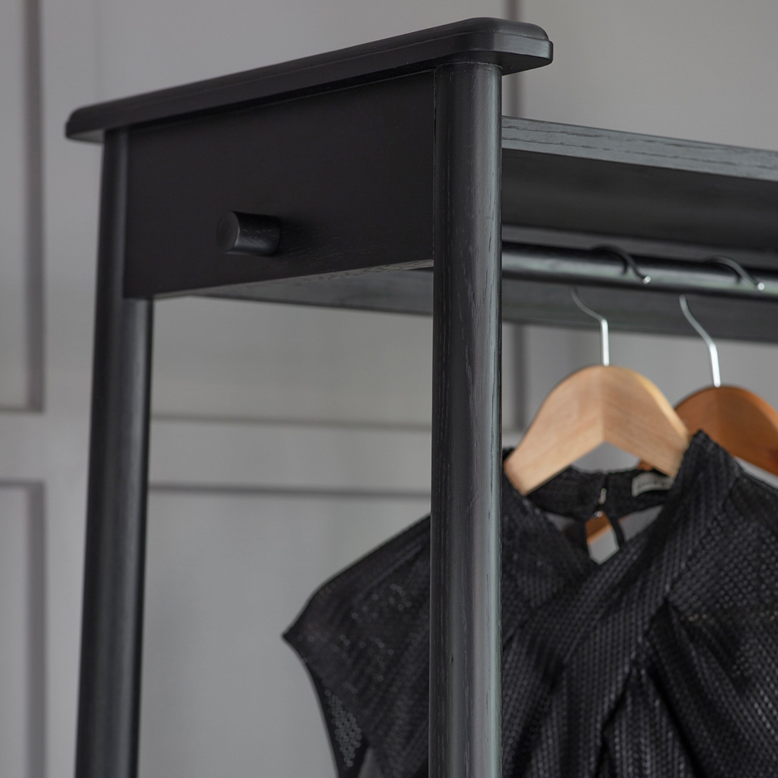 The classically stylish Branford range is made using a combination of the finest quality solid Oak and veneers and is faithful to it’s 19th Century vernacular design with a new modern twist. The new black finish of this open wardrobe introduces a bohemian inspired aesthetic which is sure to make a bold impact in your living space.