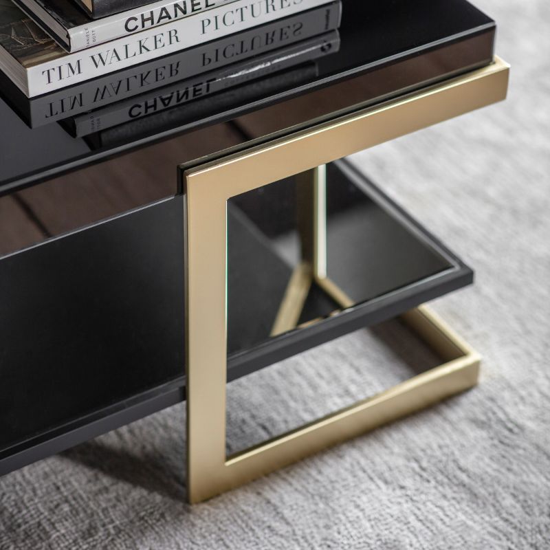 Glamorous and sophisticated, the Cadagon Mirrored Coffee Table is an eye-catching piece that will bring an element of luxury to any living space. The bold metal base with a striking gold finish contrasts elegantly with the black glass tops and shelves of this glass top coffee table, creating a unique and stylish look. Perfect for displaying your favourite items, this contemporary coffee table will liven up your living area, giving it an instant air of sophistication. Choose this black and gold coffee table to add a statement that will be a talking point in any living room.