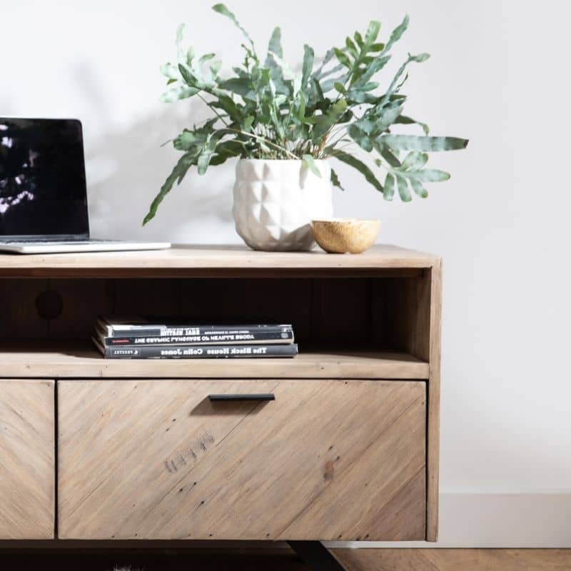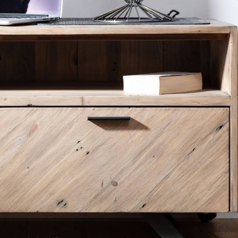 This wonderfully characterful but contemporary reclaimed wood tv unit is a perfect example of how rustic furniture can work in modern homes. The box design and black painted feet and detailing of this industrial TV stand contrast with the beauty of the reclaimed wood that doesn’t hide its natural imperfections, marks and scars developed over the years but celebrates it. Featuring two deep cupboards and a handy shelf this rustic TV unit is more than just a functional piece of living room furniture, but a stylish addition that will help you bring in a fresh yet rustic feel to the room.