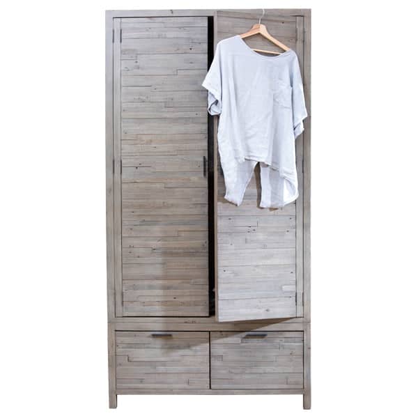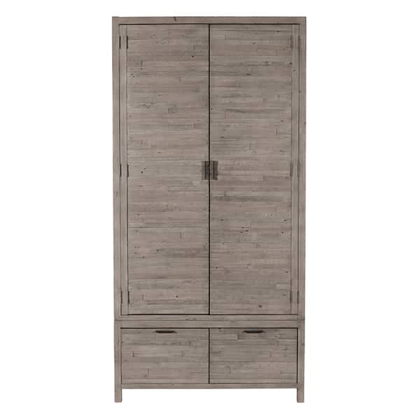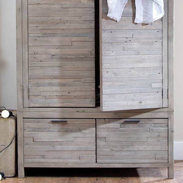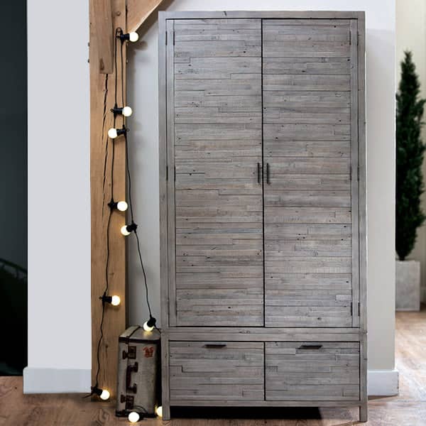 Handcrafted with a light hint of grey hard-wearing lacquer, the Dulwich Reclaimed Wooden Wardrobe comes with 2 large wardrobe door, giving you excellent clothes hanging space. This solid wooden wardrobe also comes complete with 2 large sizeable drawers, perfect for folding clothing items.