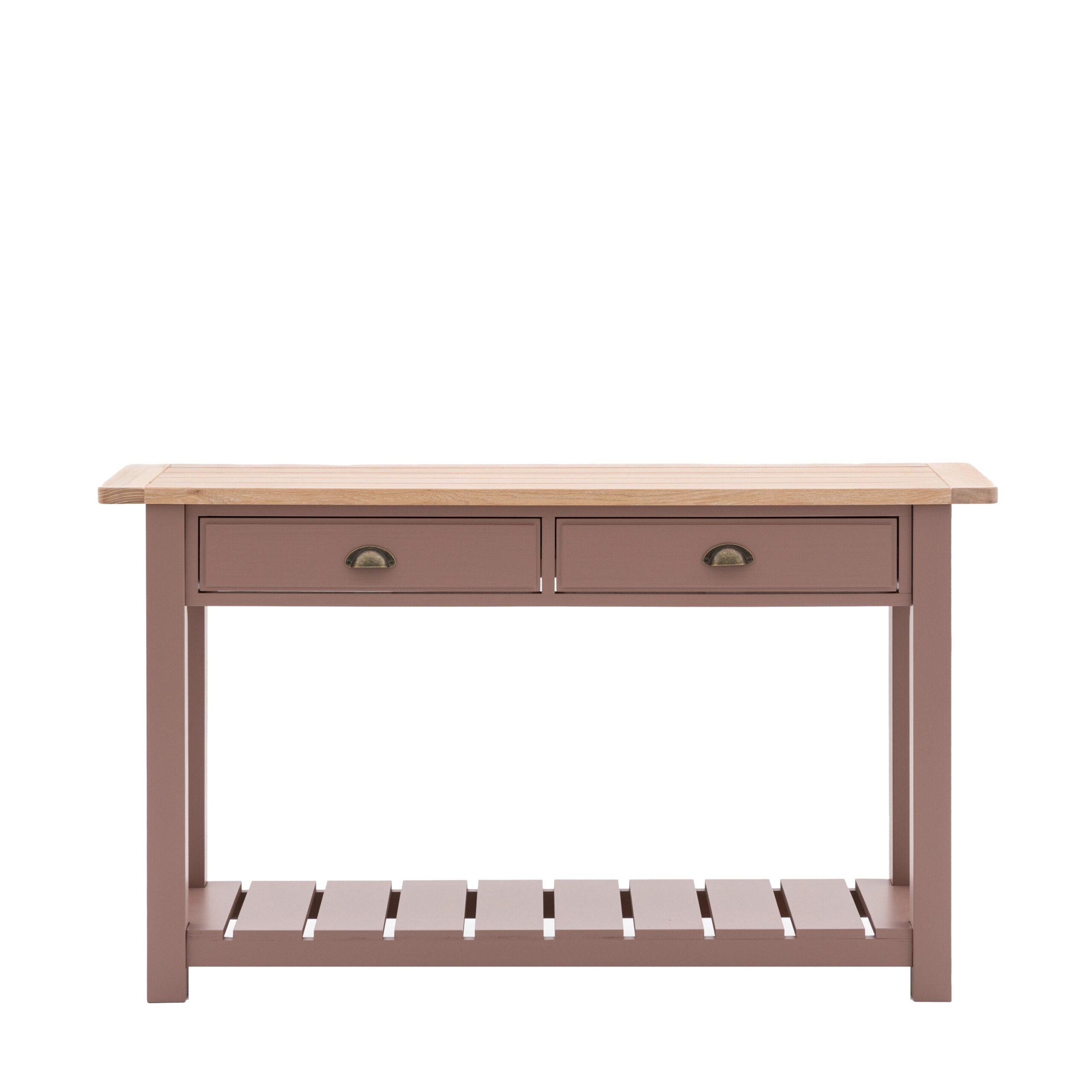 A modern update on a country classic, this console table is a versatile piece perfectly suited to both contemporary and rustic interiors. Featuring 2 drawers and a low shelf, the console table is perfect for living rooms, dining areas and kitchens alike, offering great additional storage. The hand painted subtly textured finish with metal drawer pulls and grooved & planked oak top add a modern twist to this country style console.