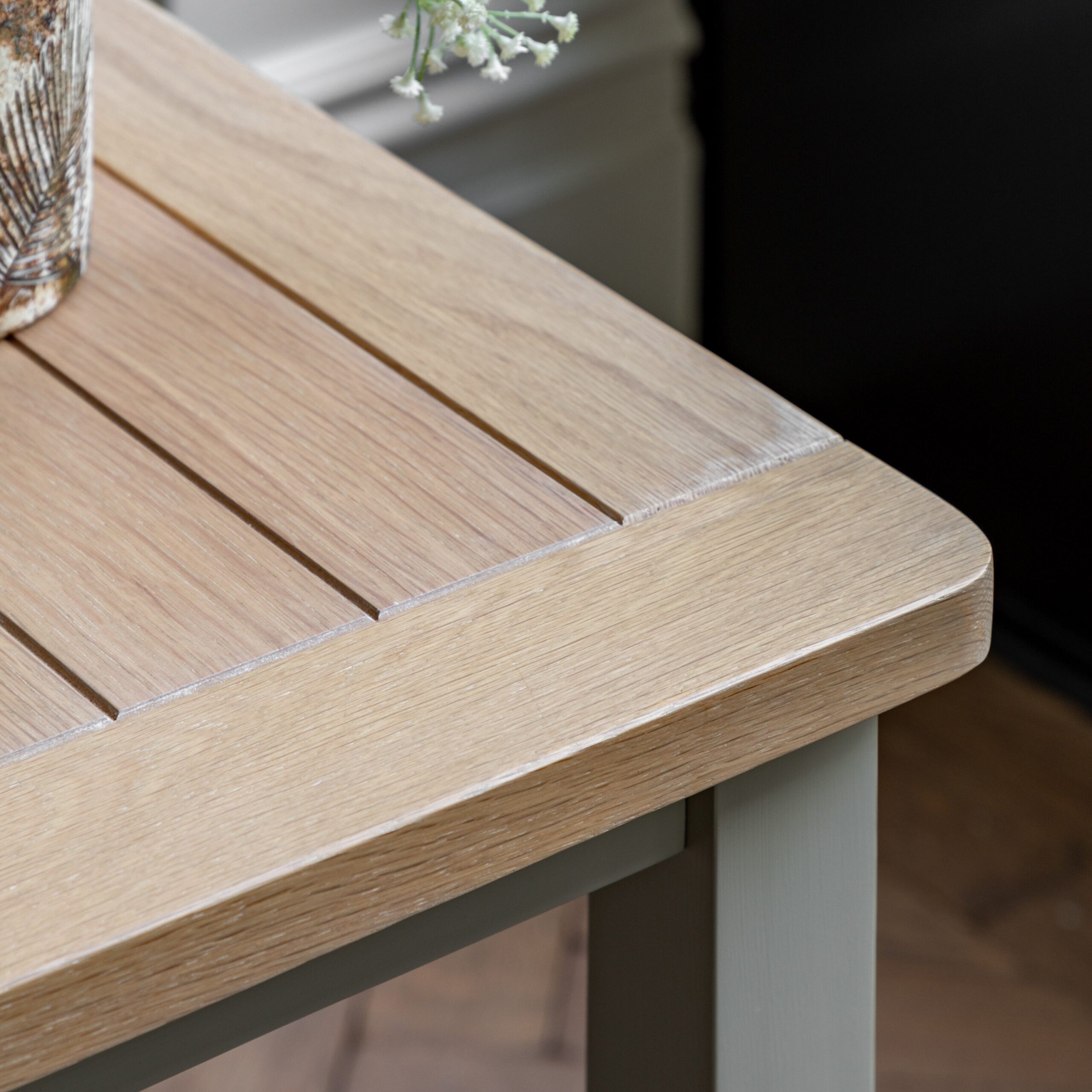 Presenting our chic side table, where classic craftsmanship meets modern sensibilities. At its heart, the table exudes a timeless charm, embodied by the grooved and planked oak top, revealing the intricate patterns and rich hues of the wood. This traditional appeal is beautifully juxtaposed with a hand-painted body, rendering a fresh and updated look.