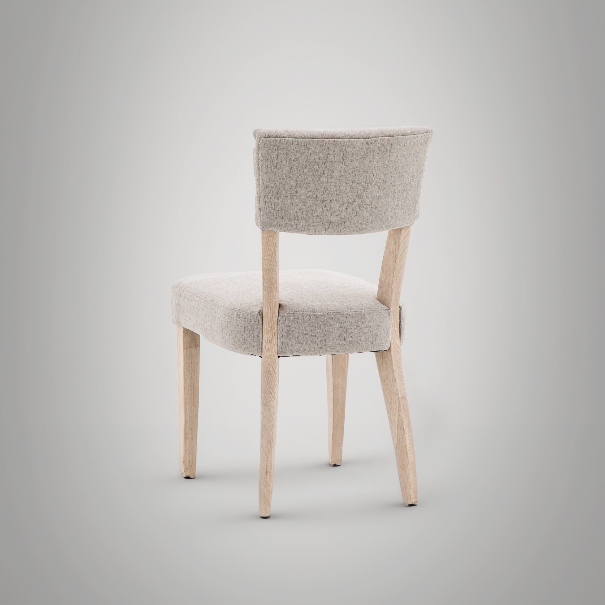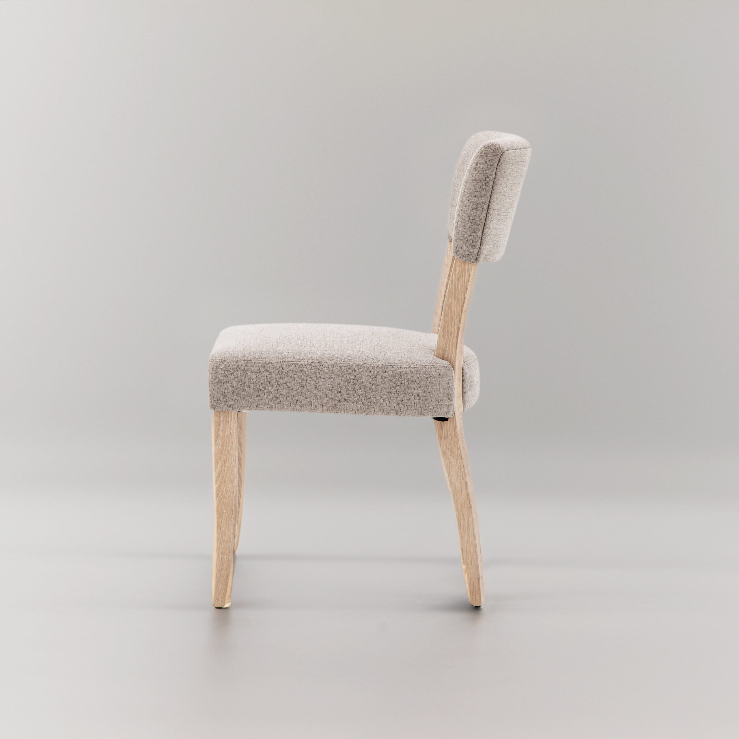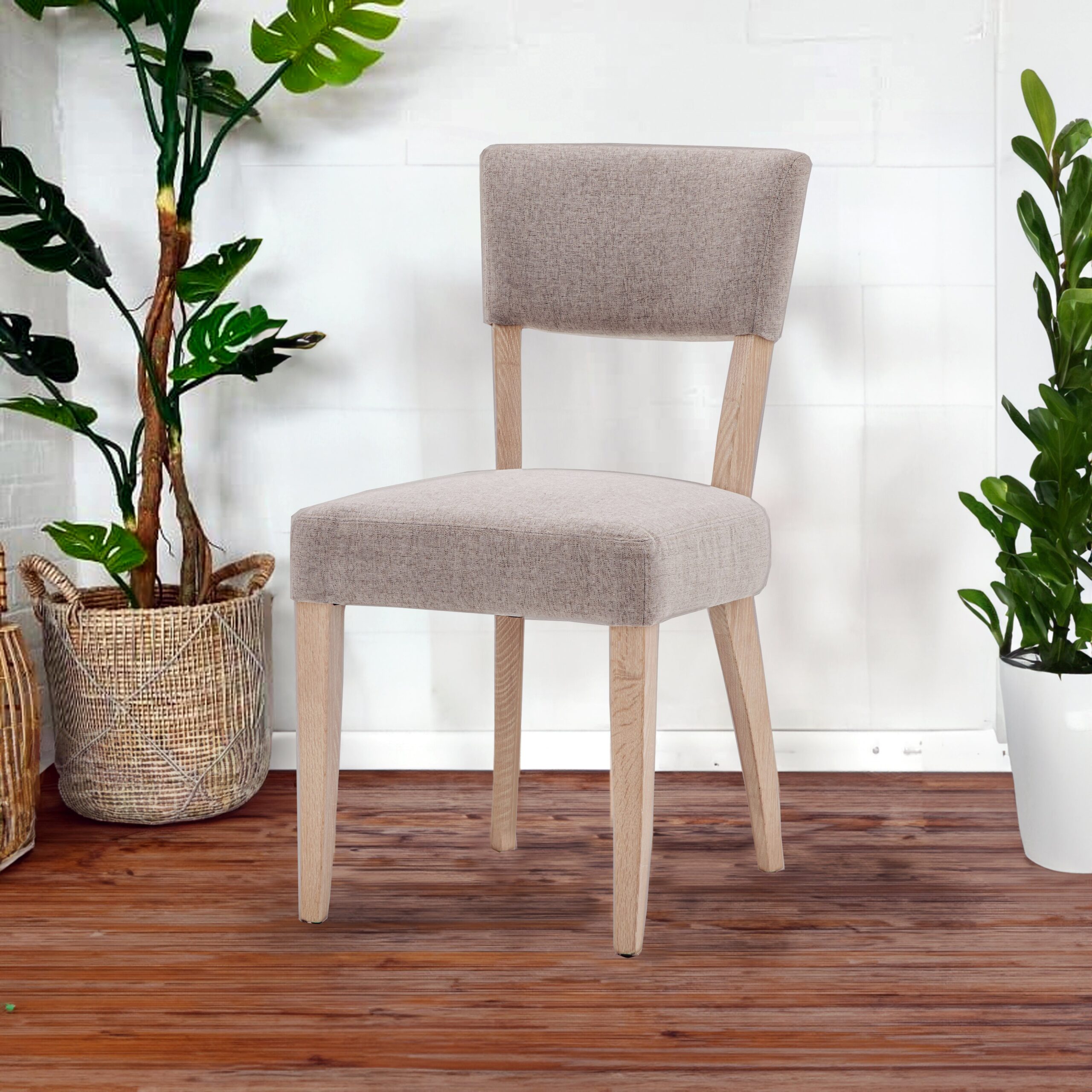 Set of 2 elegant upholstered dining chairs which are a perfect match to almost any dining table or interior from the traditional to the modern. Upholstered in light grey linen with gently curved oak legs for a elegant finishing touch.
