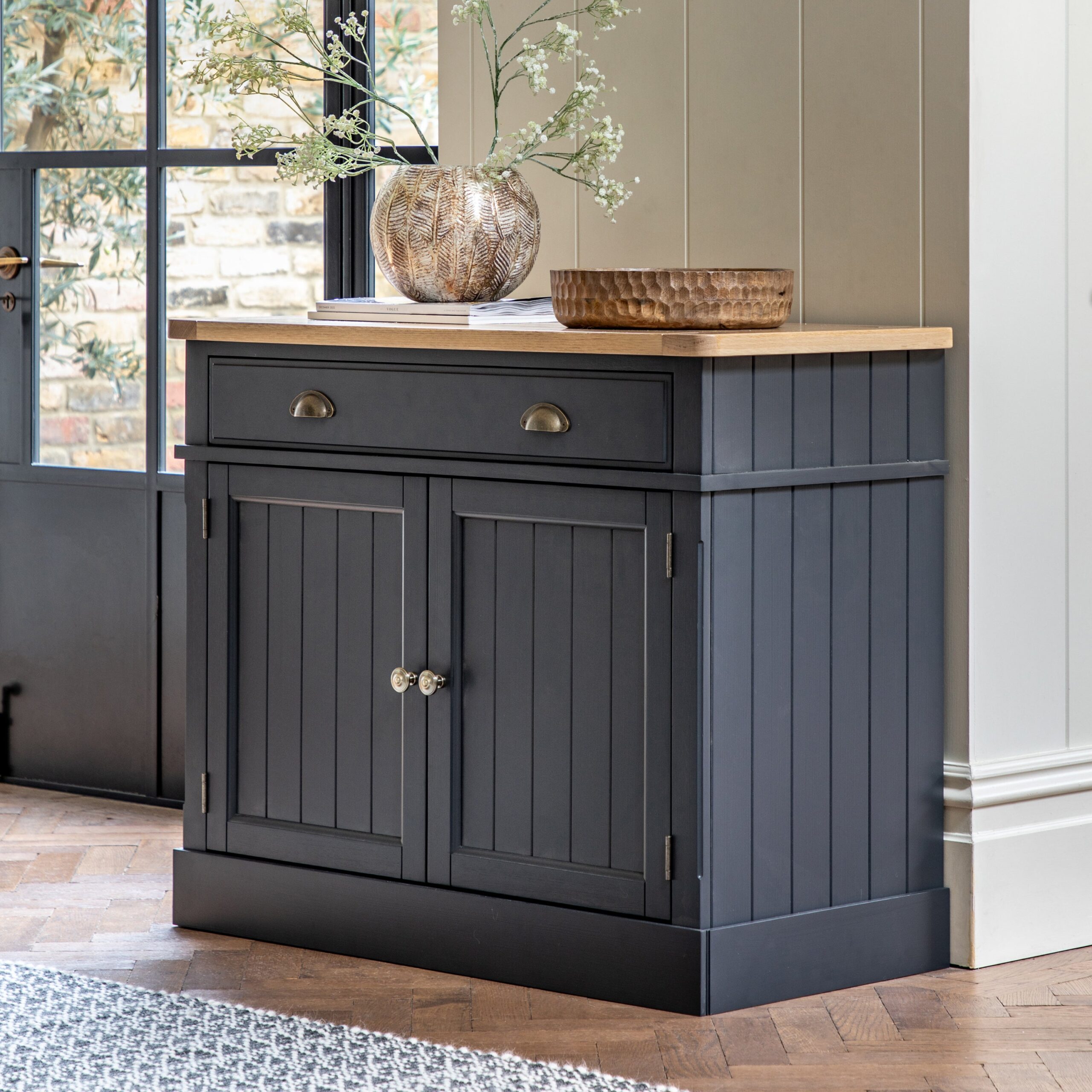 A solid wood sideboard that is both stylish and practical is a thing of beauty and the eye-catching Elton Wooden Sideboard is the perfect blend of function and form. The large drawer and two deep cupboards provide plenty of storage space, while the adjustable shelves offer further flexibility. Sporting a grooved and planked natural oak top, the hand-painted and subtly textured grooved doors of this painted sideboard give it a timeless style with the metal cup handles adding an instant modern farmhouse feel. Perfect for rustic or contemporary interiors, this wooden cabinet is a must-have addition to any kitchen or dining area. Assembly required /Free Delivery to most mainland UK*