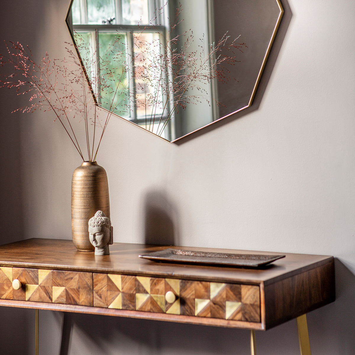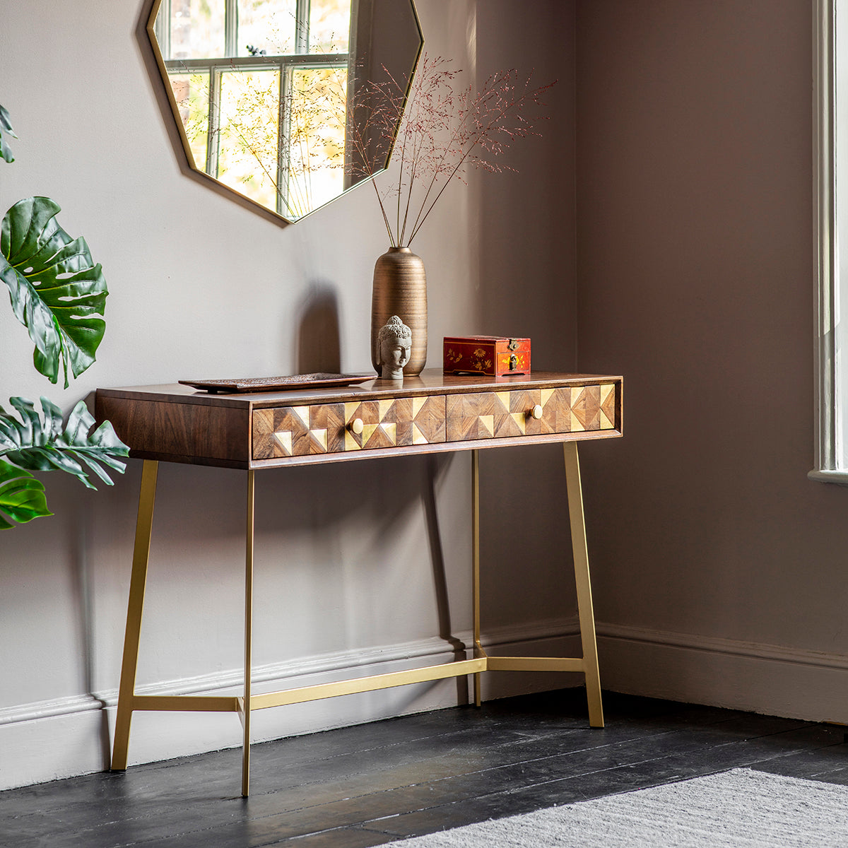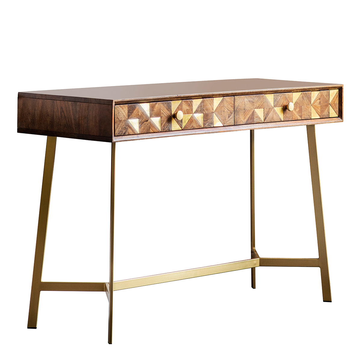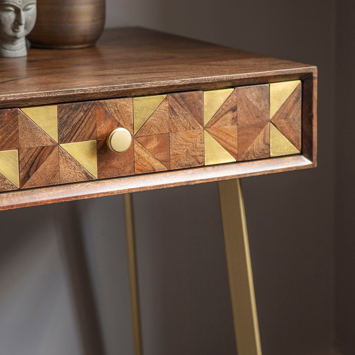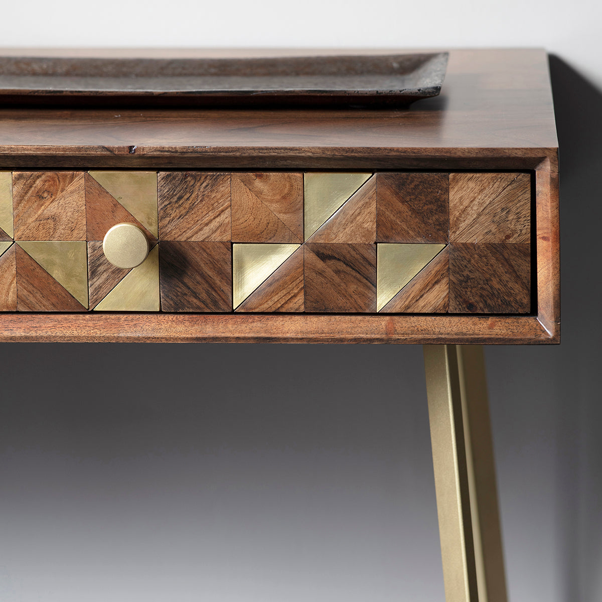 This versatile piece serves both as a desk and a console, designed with dual functionality in mind. Equipped with two practical drawers, its standout feature is the brass wrapped inlays paired with sections of Acacia wood. Beyond its utility, this furniture piece stands as a distinctive conversation starter in any room.