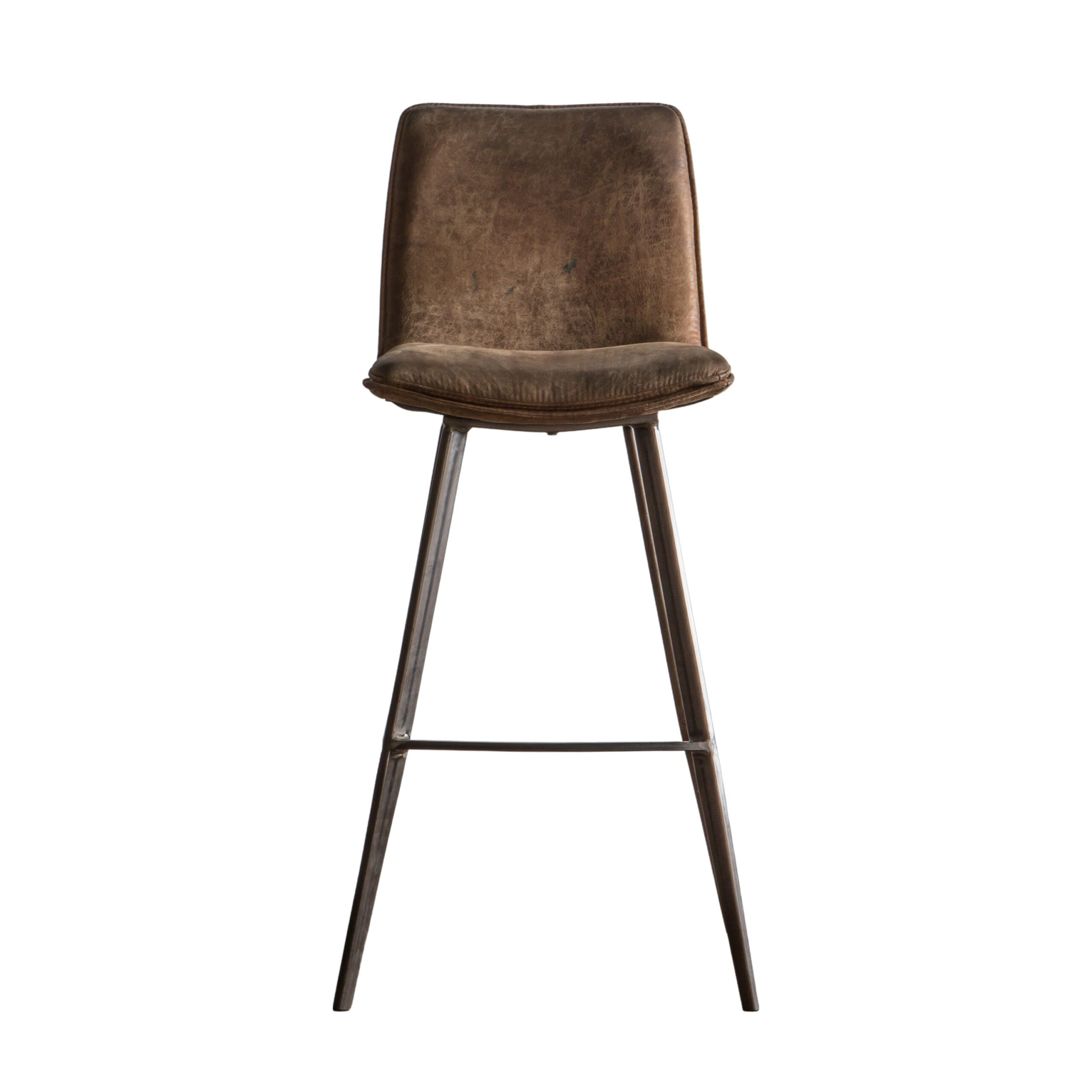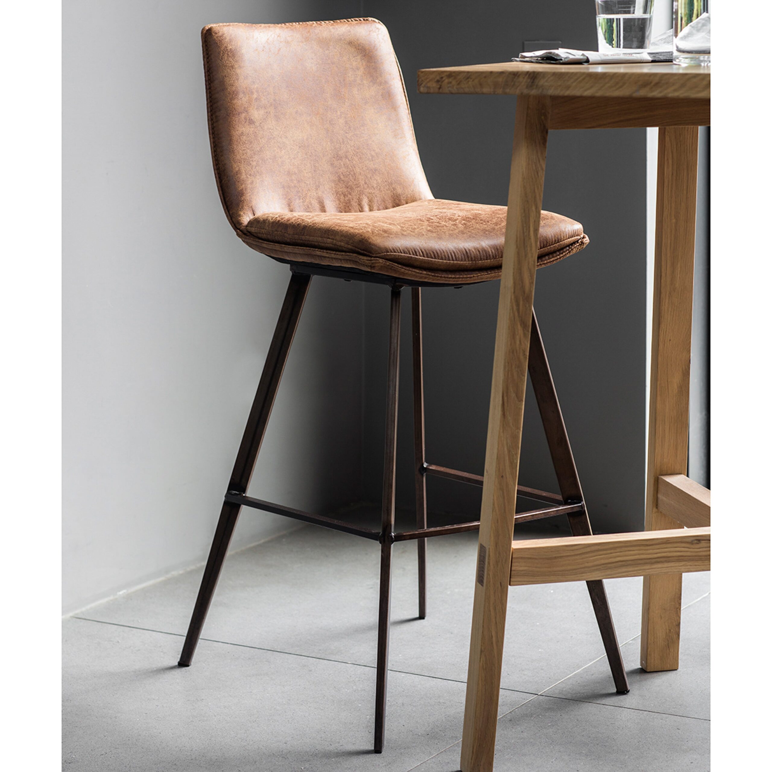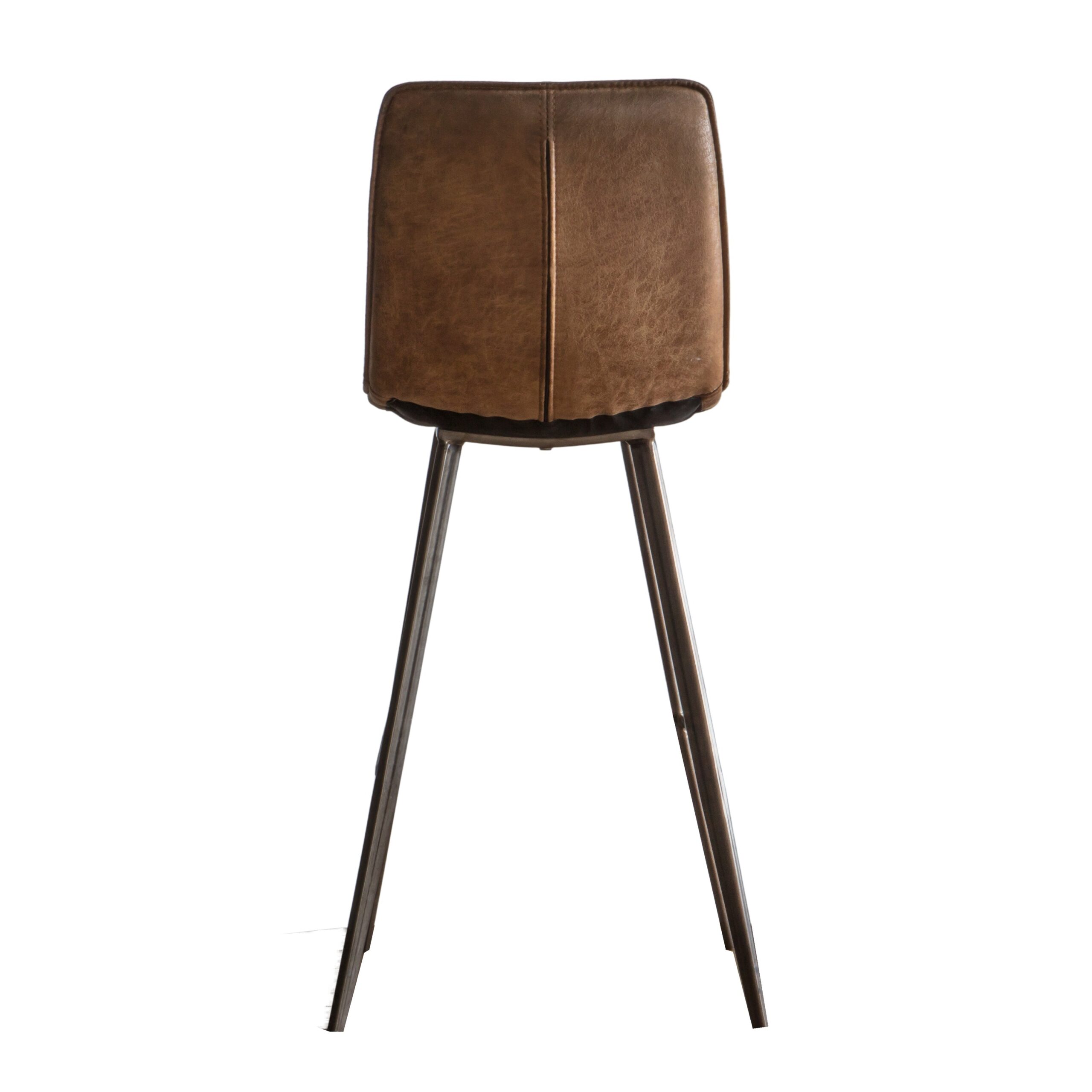 A contemporary design with a rustic twist, this stylish vintage brown faux leather bar stool is perfect for casual dining areas, featuring stitched seam detailing and sleek angled bronze metal legs.