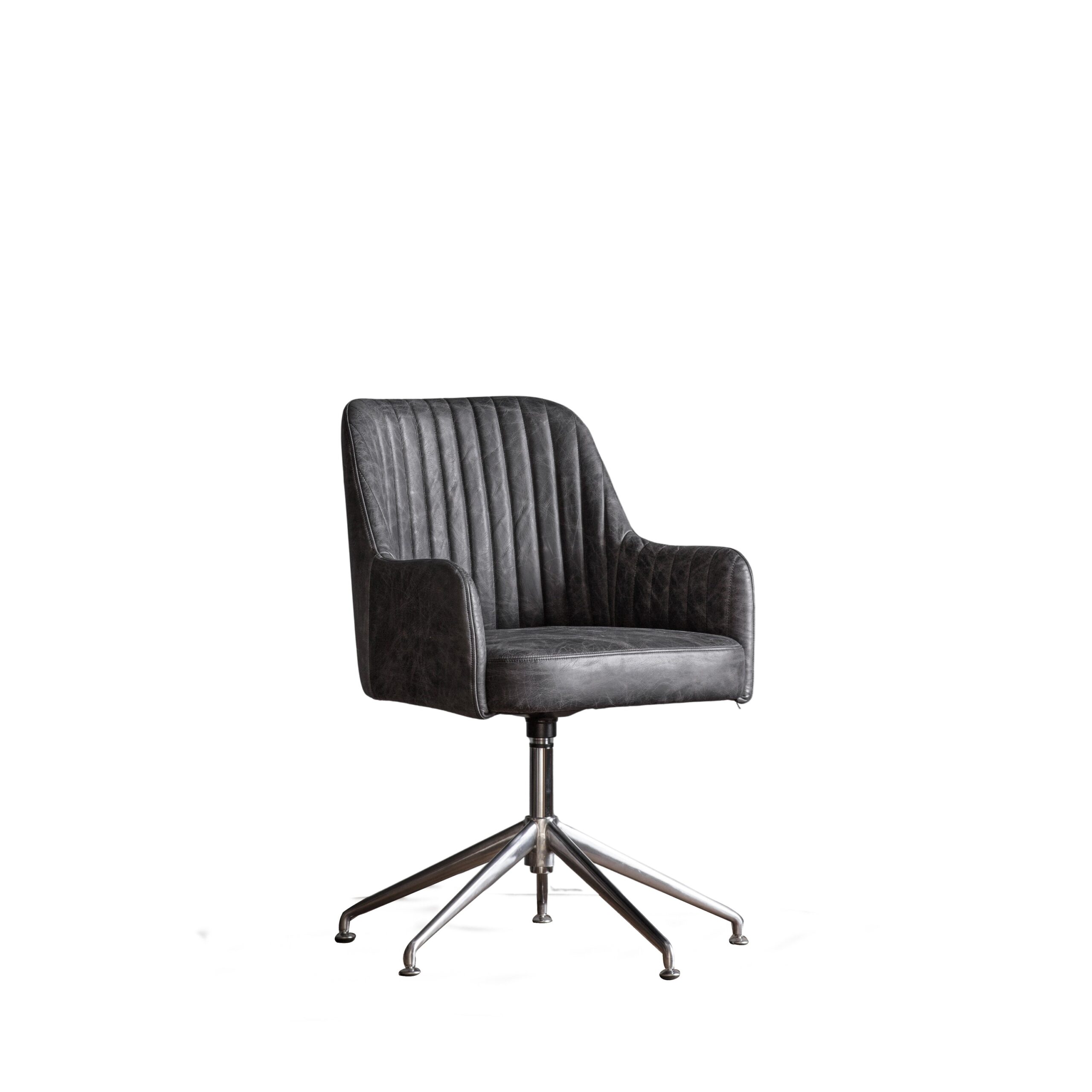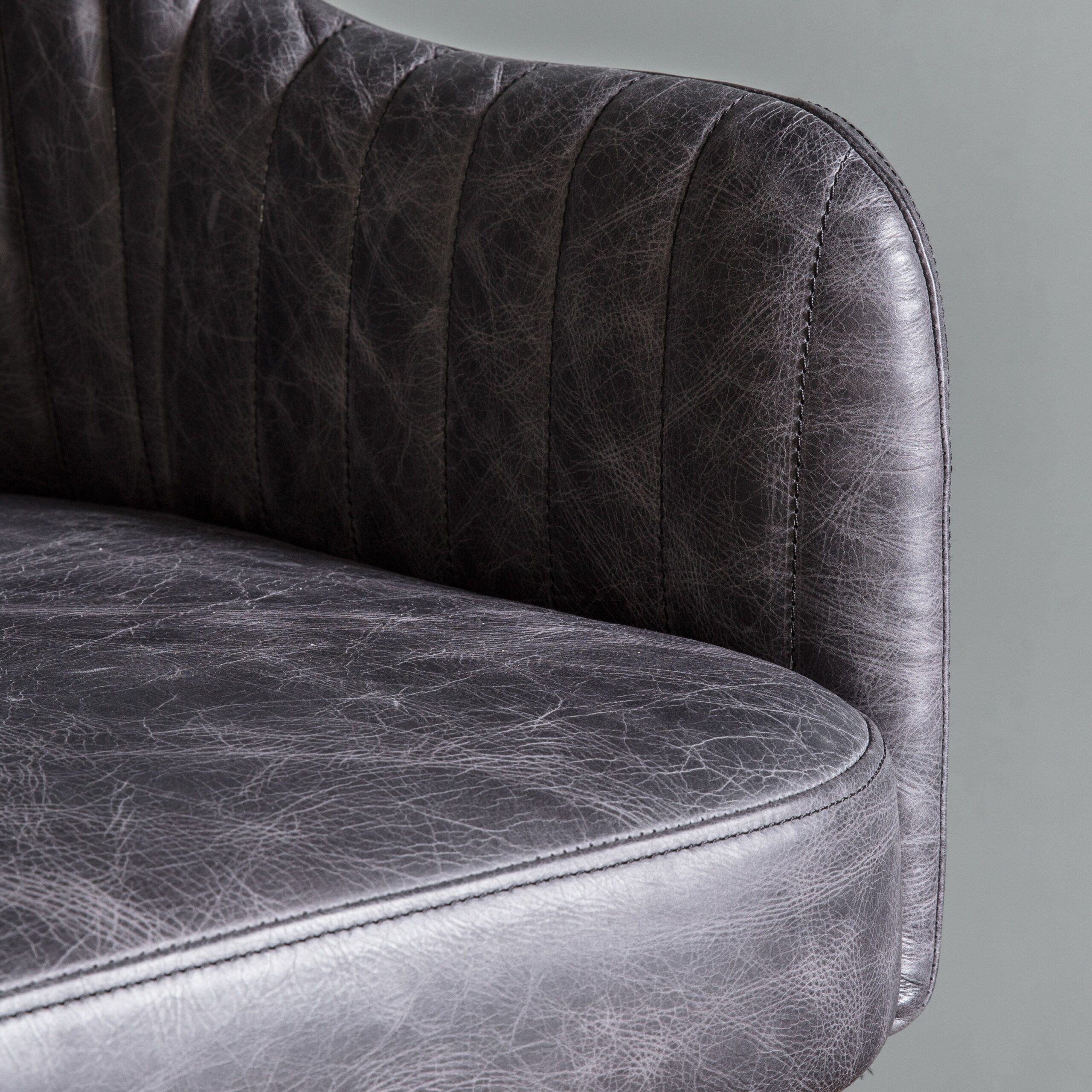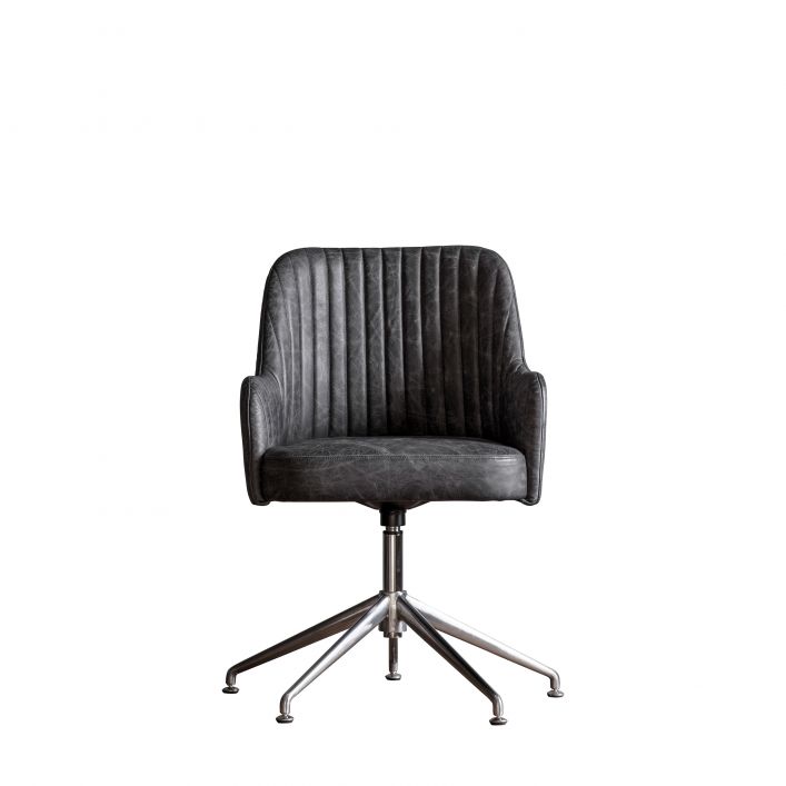 Discover the perfect blend of classic elegance and modern functionality with the Heritage Swivel Chair in Antique Ebony. Ideal for any home office setting, this chair boasts genuine full leather hide upholstery, accented with distinctive vertical stitching. Prioritising comfort, it features a deeply cushioned seat and a lightly padded back and sides. Its robust base, adorned with a sophisticated silver finish, ensures stability while you work. Although the seat offers a smooth swivel function, please note its height remains fixed. Upgrade your workspace aesthetics with this timeless office chair design.