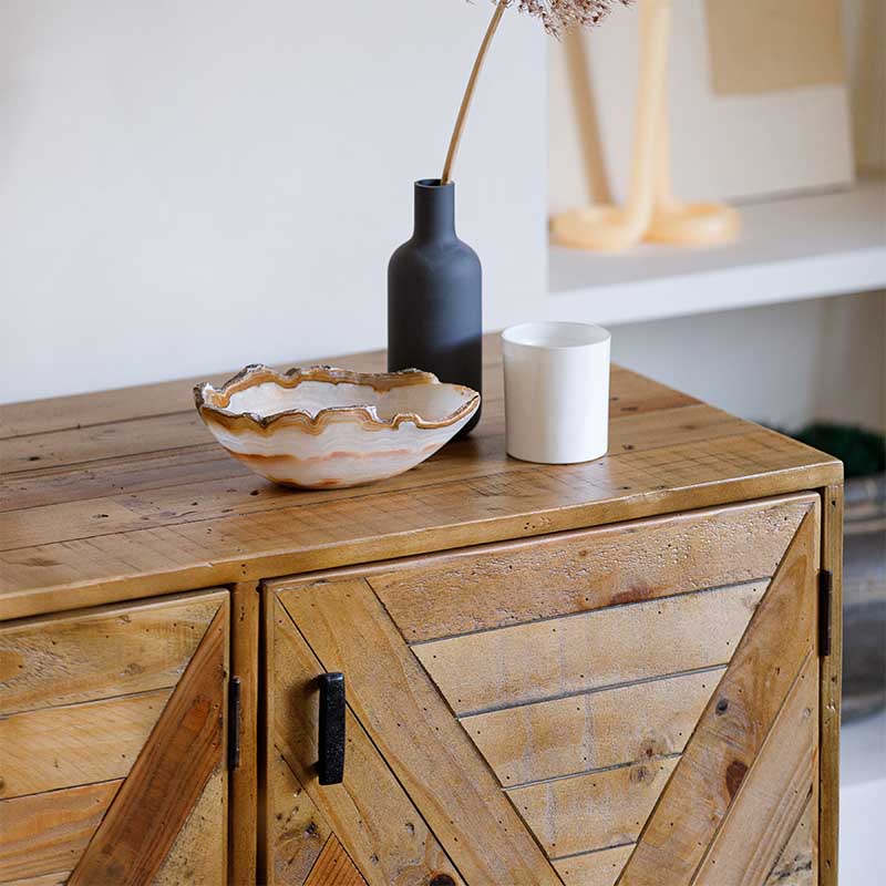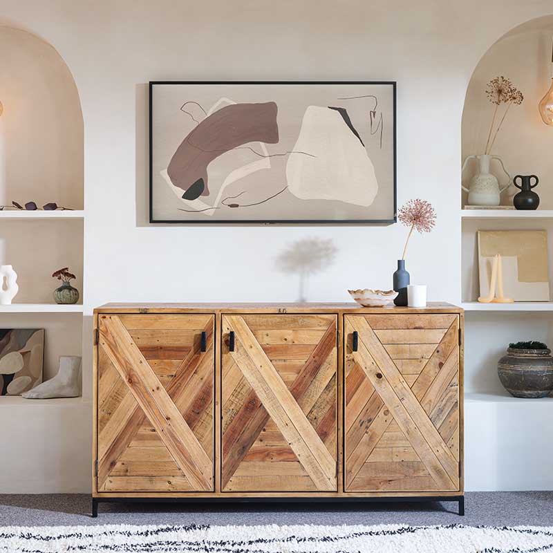 A wooden sideboard is the perfect storage solution for your home and the Ironbridge Industrial sideboard boasts both style and function. Crafted in high-quality FSC certified reclaimed wood, this rustic sideboard has been kept as natural as possible to showcase the natural undulations and unique markings giving you a glimpse into its previous life. Set in an eye-catching pattern to emphasise the beauty of wood further, this large sideboard would sit comfortably in both a rustic or industrial interior scheme. Featuring three deep cupboards offering ample storage, the black steel powder-coated handles and legs add further to the appeal of this reclaimed wood sideboard.