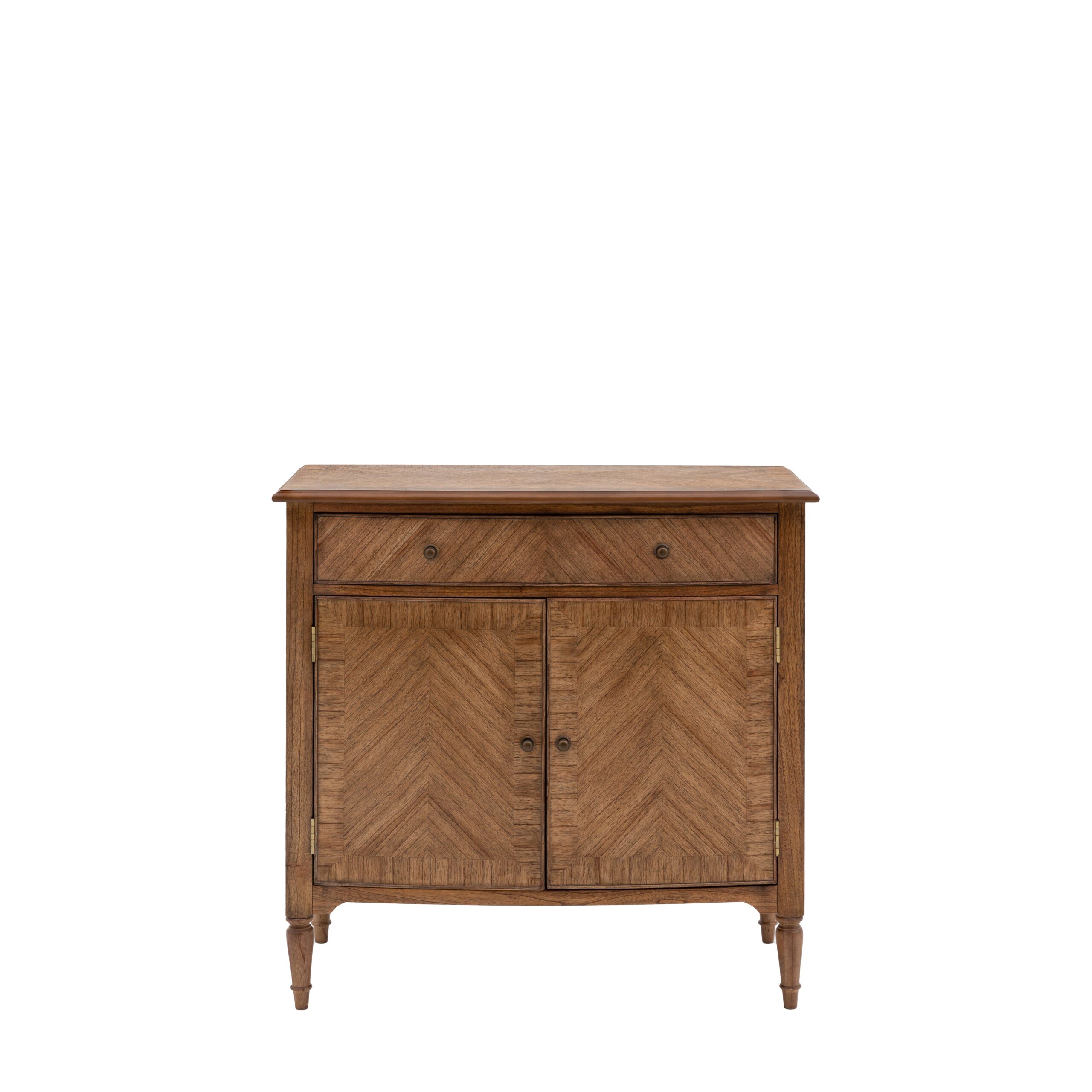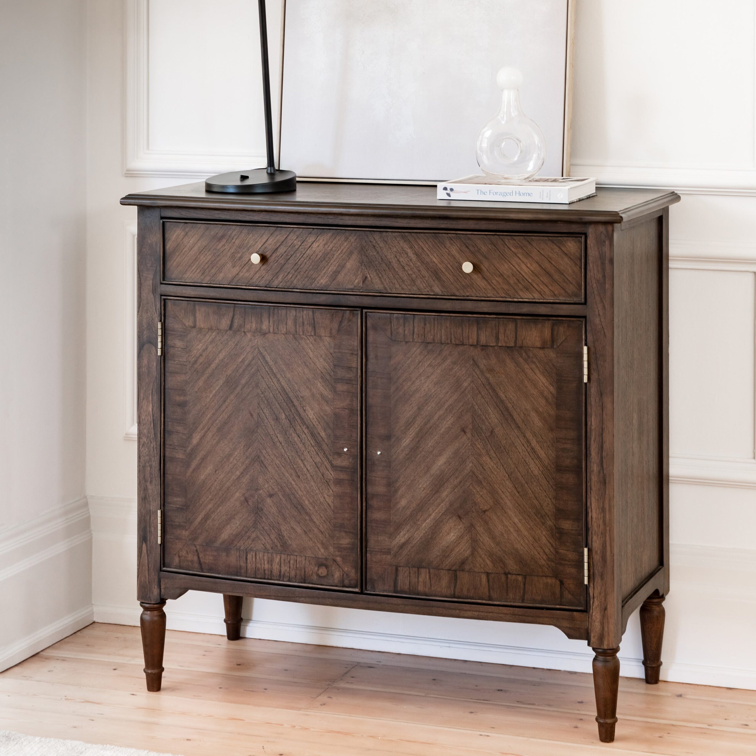 This stunning sideboard features rich tonal mid brown Mindy wood veneer marquetry and bronze beehive pull handles , creating a beautiful ‘new traditional’ look. With its timeless, elegant style and a modern touch the 2-door cupboard and 1 drawer make it a practical yet stylish storage solution.