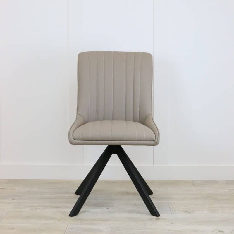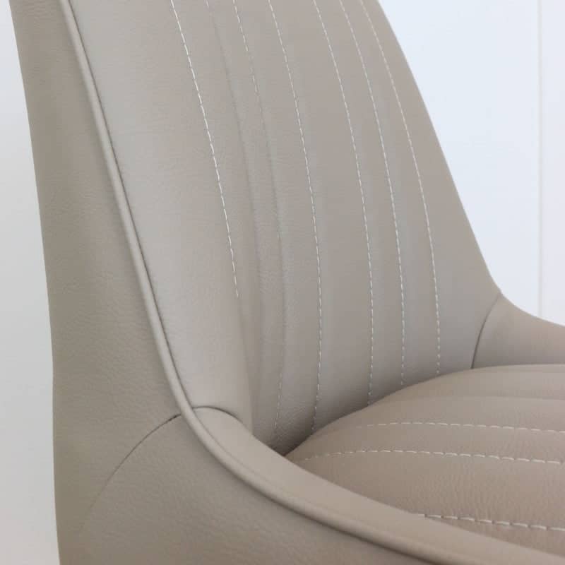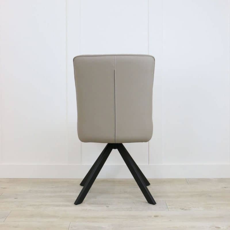 Fans of clean contemporary lines will be smitten with these modern dining chairs. Beautifully crafted in faux leather as soft and luxurious as the leather itself, these vegan dining chairs will add a timeless elegance to your dining space. The slim legs in matte black steel contrasts with the light neutral shade of the faux leather, which has been stitched to reveal a quilted design that has both a modern and retro feel.
