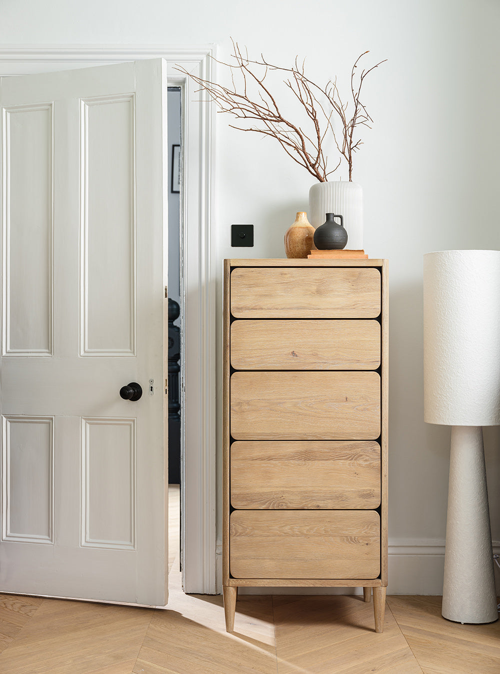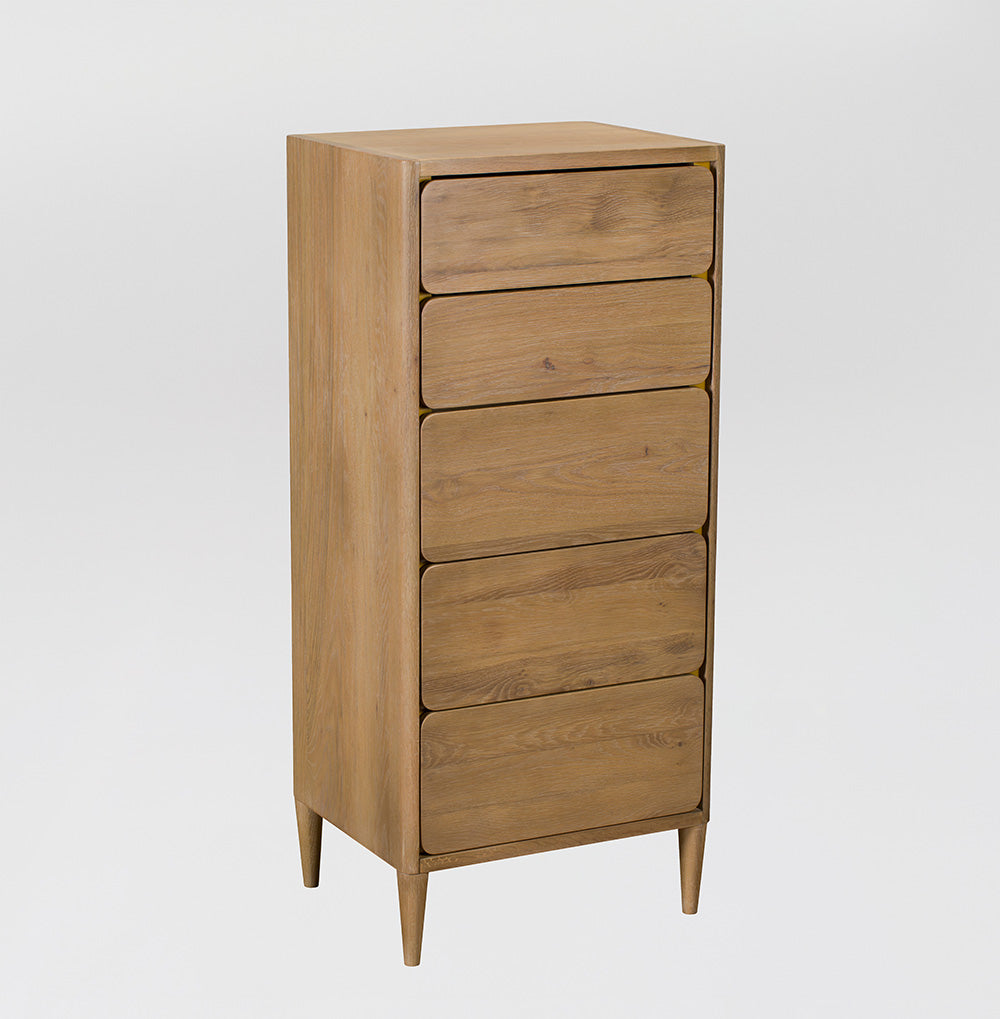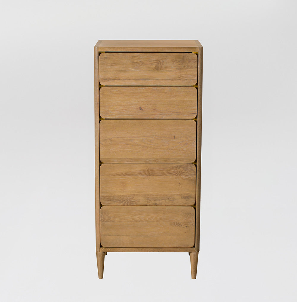 Vertical elegance meets practical design with the Luna 5-Drawer Tall Chest. Each drawer is a home for your belongings, crafted to stand the test of time with the resilient beauty of oak.