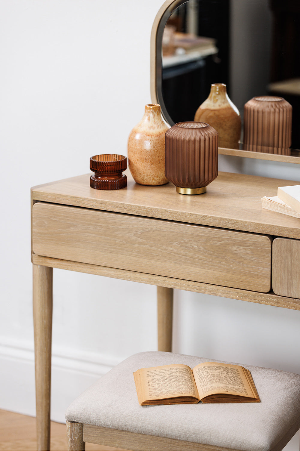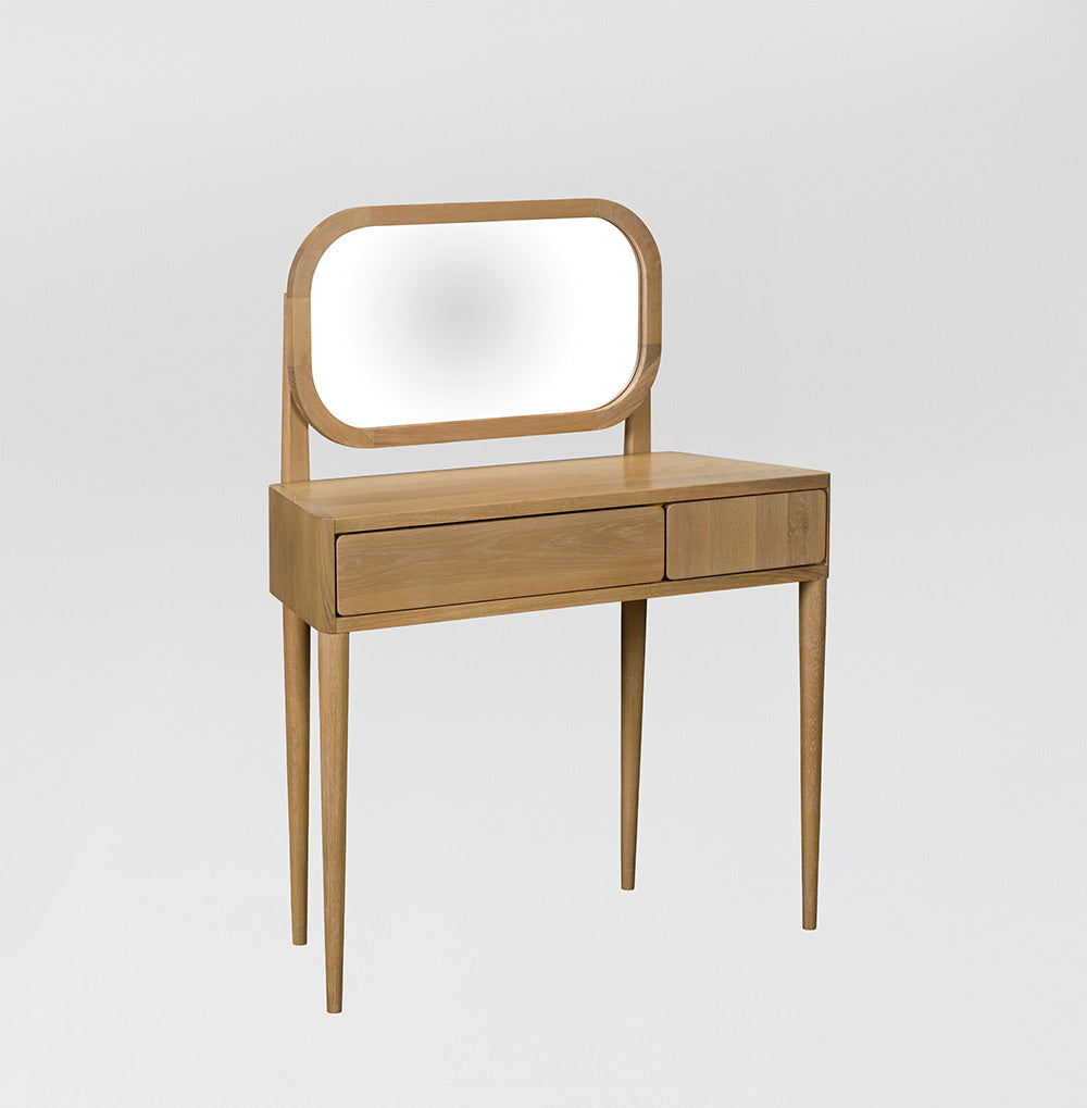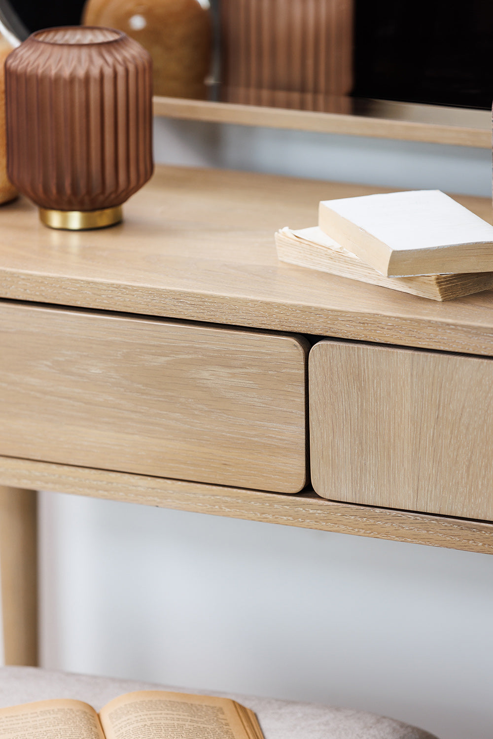 Prepare for the day with the Luna Dressing Table, featuring a gracefully framed mirror. Its smooth oak finish provides a peaceful setting for your morning routine.