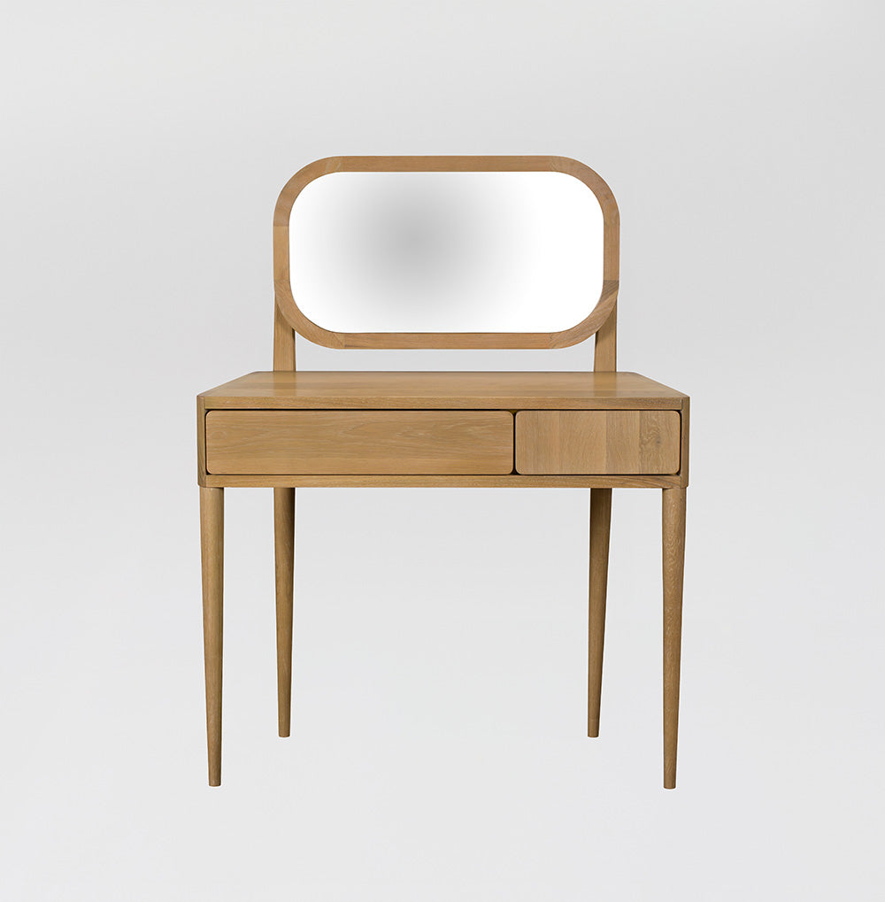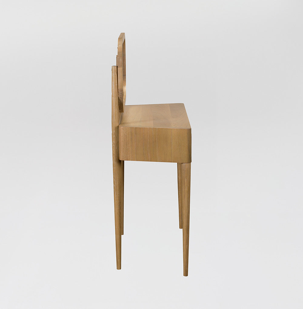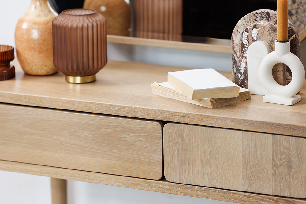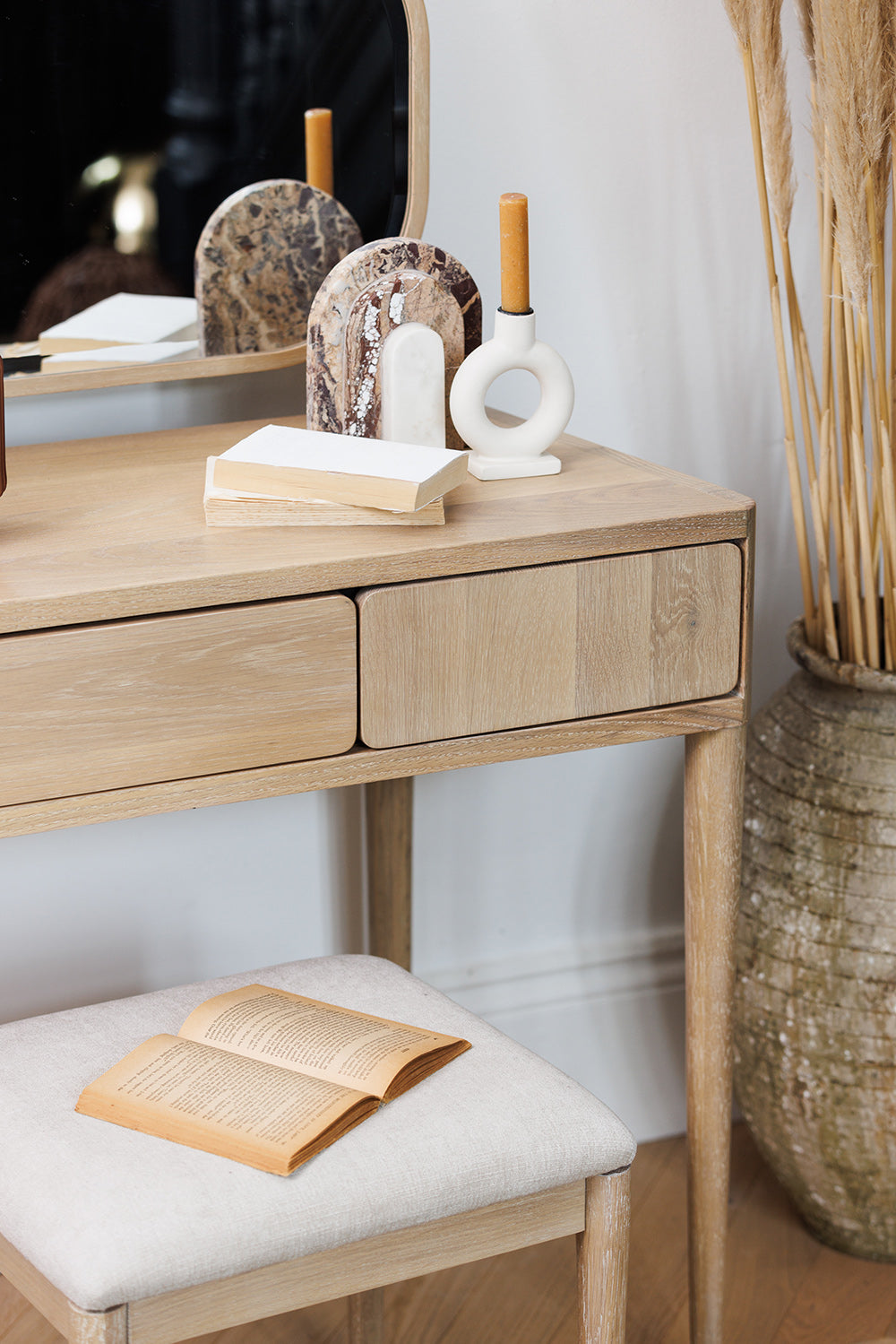Prepare for the day with the Luna Dressing Table, featuring a gracefully framed mirror. Its smooth oak finish provides a peaceful setting for your morning routine.