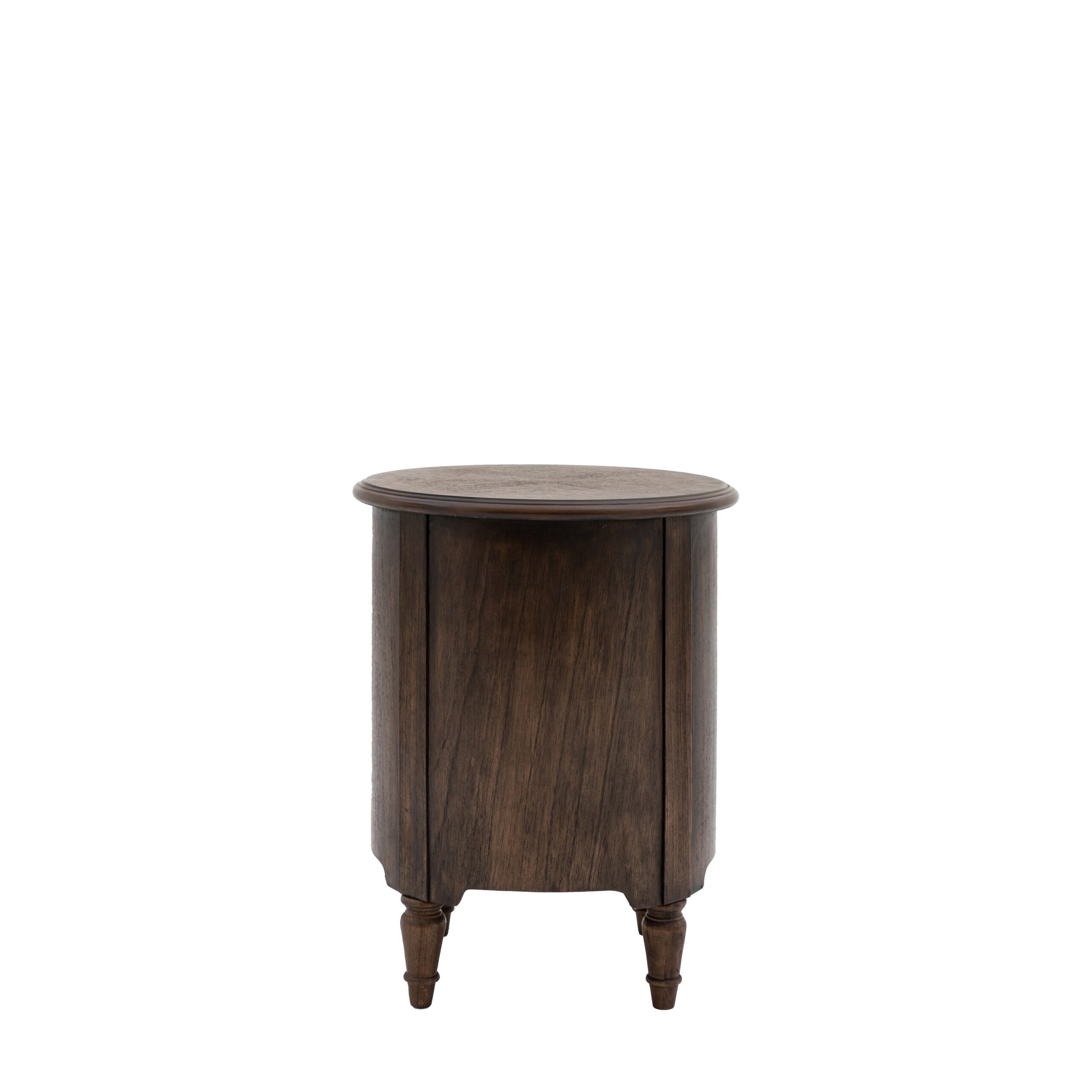 Offering a ‘new traditional’ look with a timeless elegant style and a modern touch. In dark salvaged coffee coloured Mindy wood solids & veneers and featuring marquetry details this drum side table is elegantly sophisticated. The satin brass handles and turned spindle feet add the finishing touch. A small drawer and cupboard make this side table a stylish storage solution, perfect for the bedroom or living spaces alike.