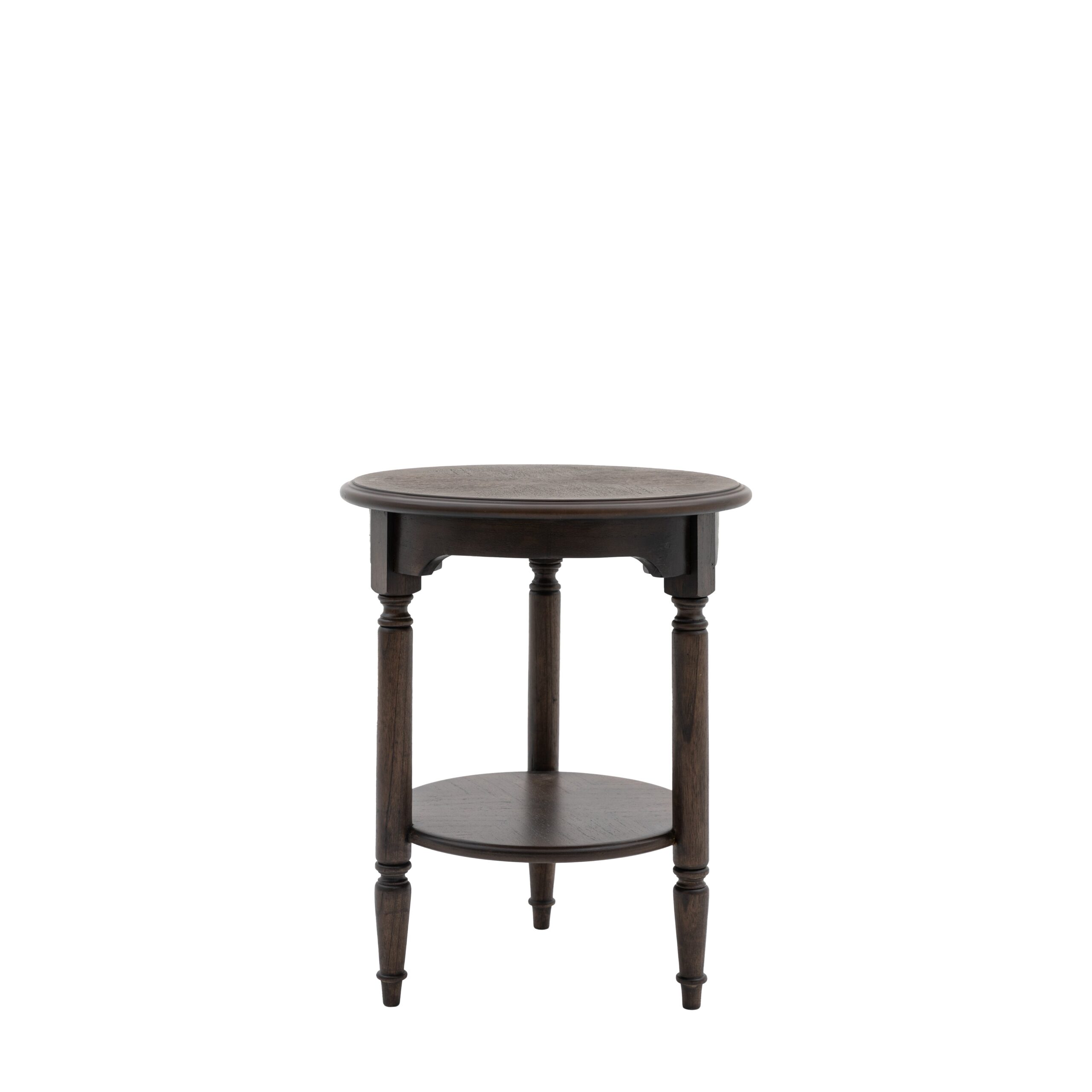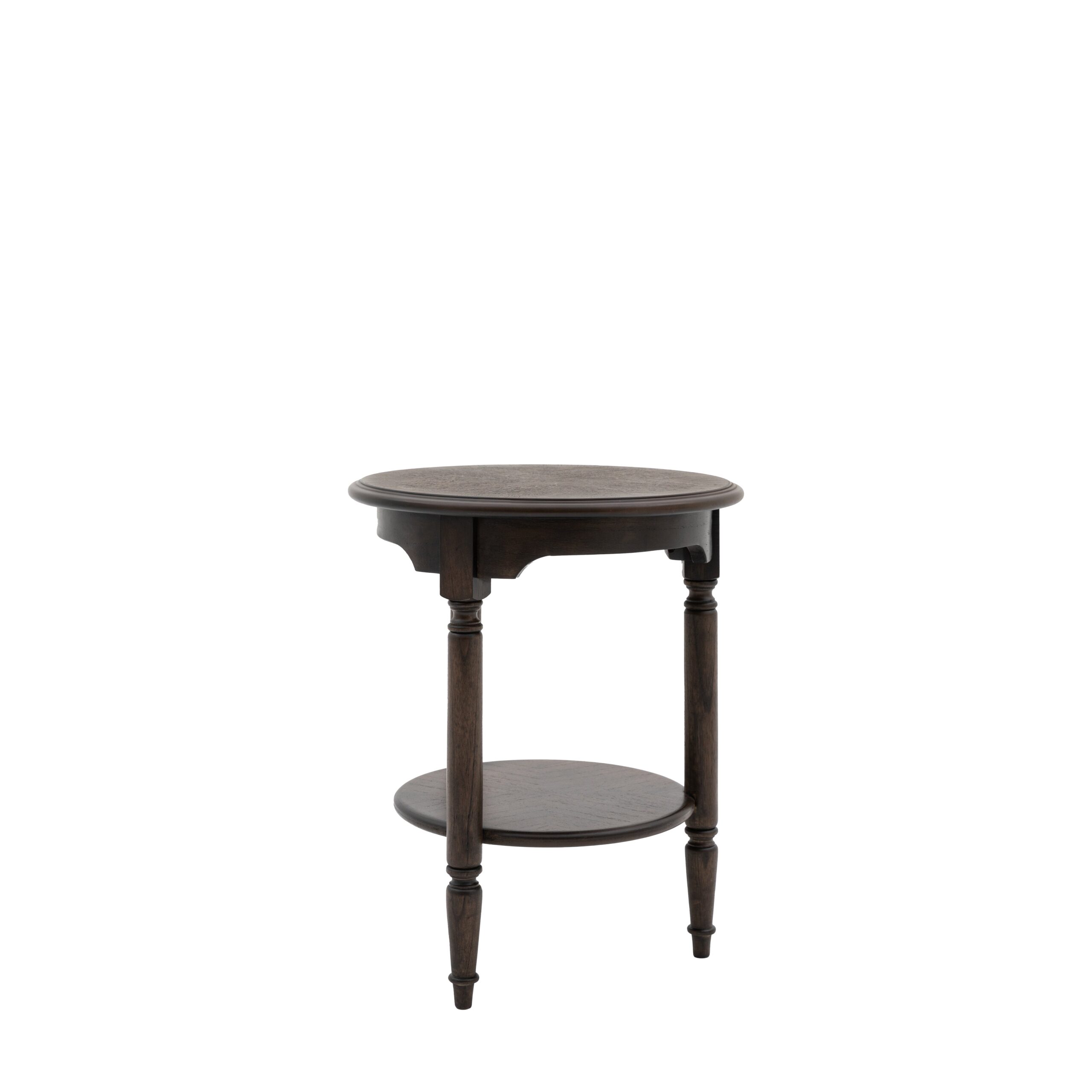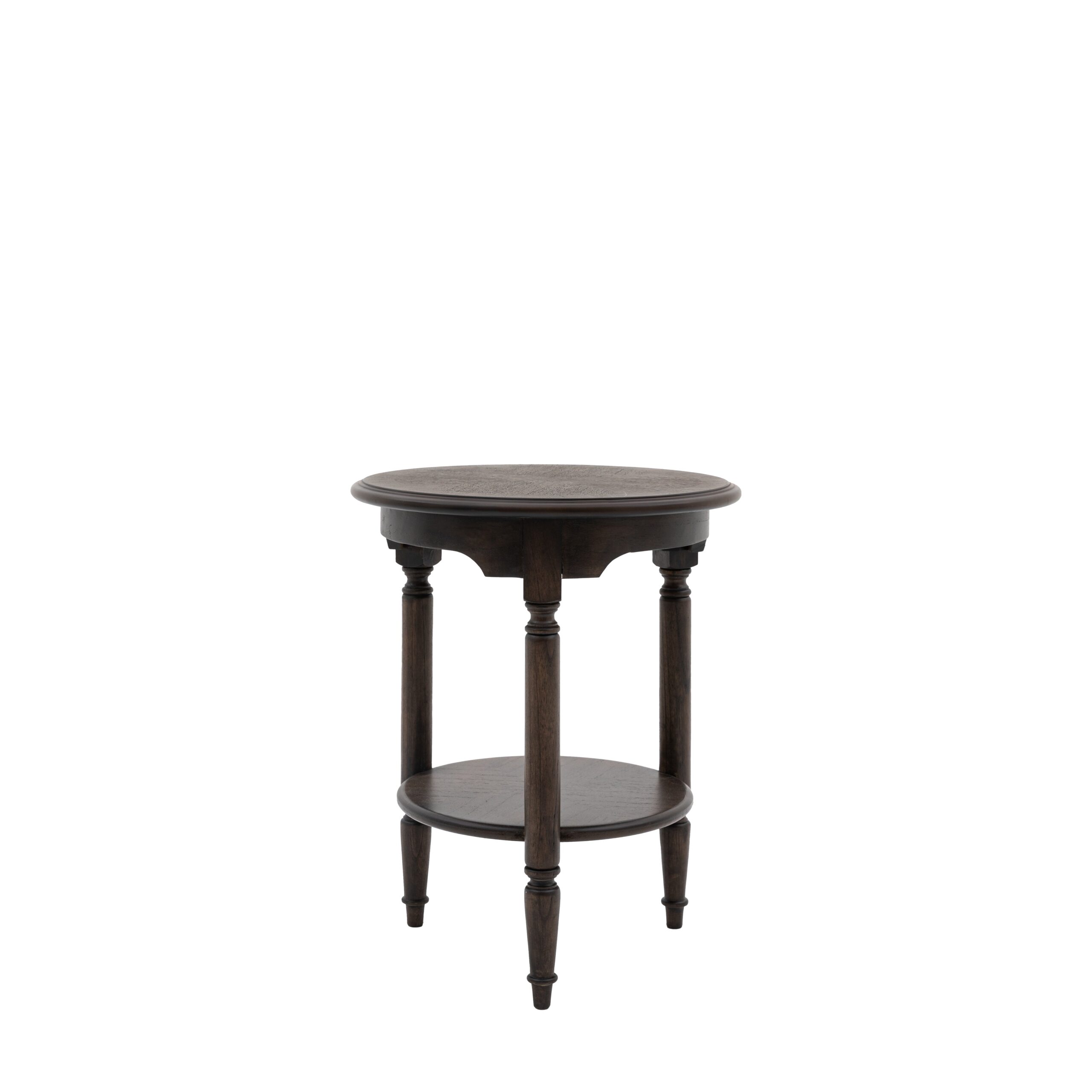 Offering a ‘new traditional’ look, with a timeless, elegant style and modern touch, this stunning side table features exquisite dark salvaged coffee coloured Mindy wood solids & veneers. The book matched marquetry detail and turned spindle legs create a stunningly elegant side table.