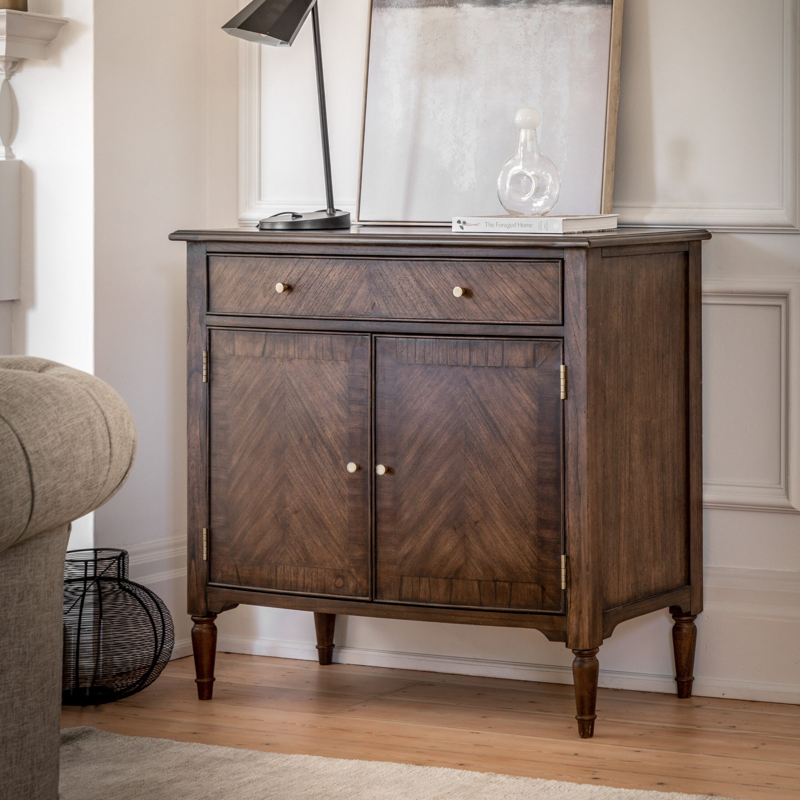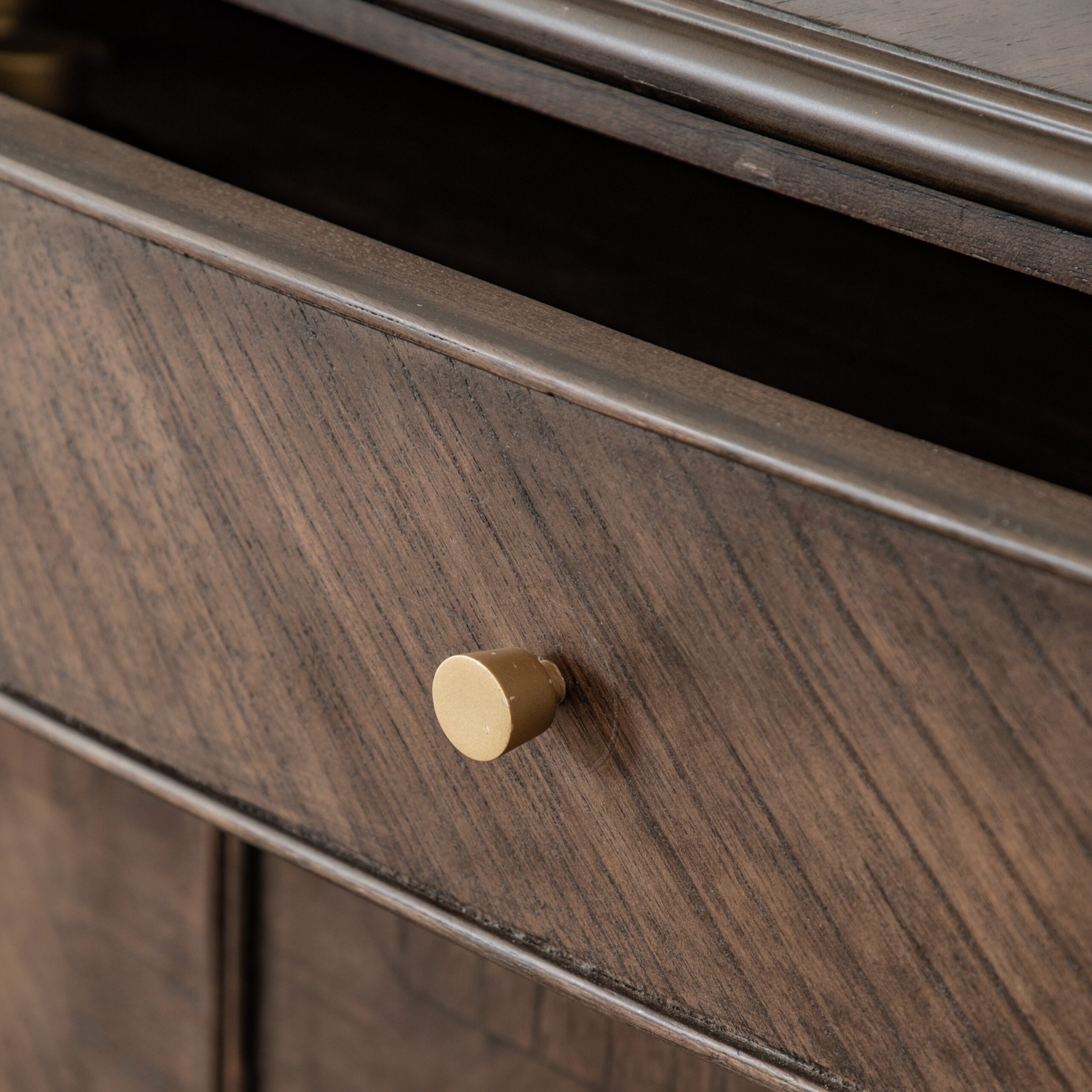 This stunning sideboard features stunning dark salvaged coffee coloured Mindy wood solids & veneers with inlaid marquetry and book-matched details. Offering a ‘new traditional’ look, with its timeless, elegant style with a modern touch. The large 2-door cupboard and 1 drawer are finished with satin brass handle pulls making it a practical yet stylish storage solution.
