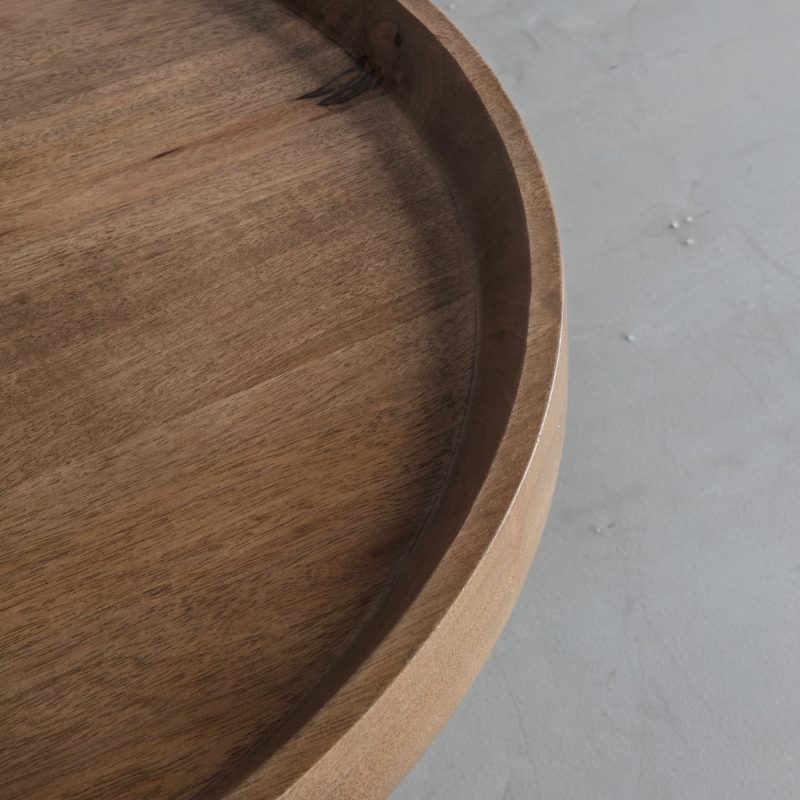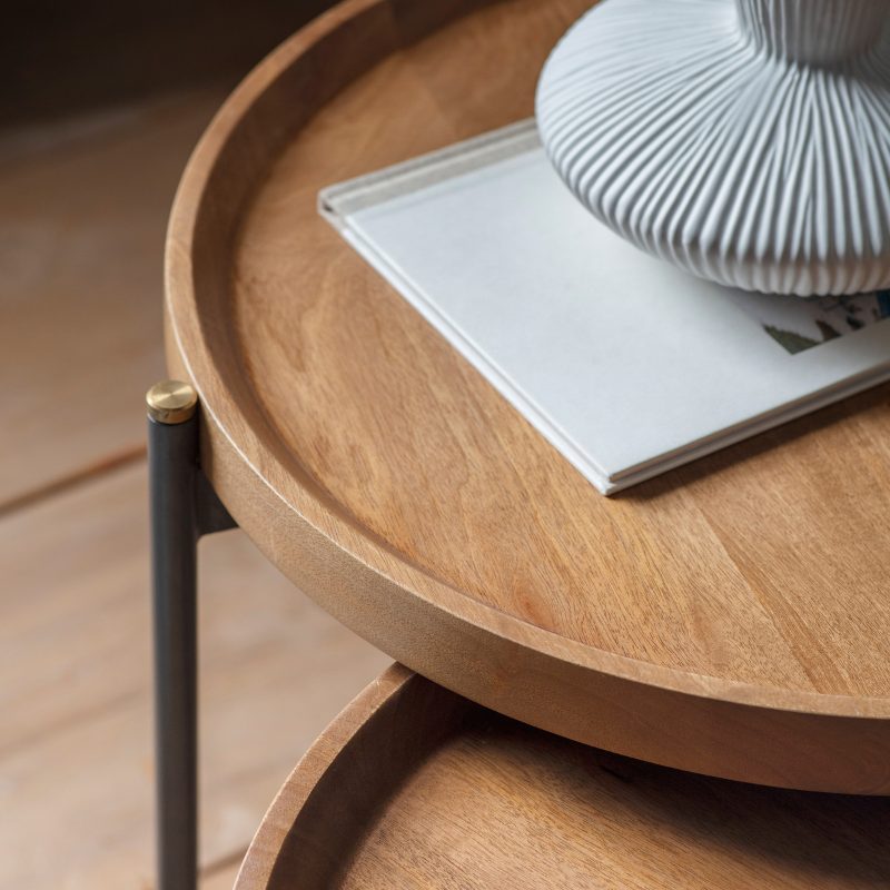 The Melbury round nest of tables is the ultimate industrial set. With a mango wood top, this nest of side tables celebrates the wood’s natural grain that contrasts with the black metal base. The brass detail on the top of the legs adds an extra touch of sophistication to this stylish mango wood nest of side tables. Minor assembly required.
