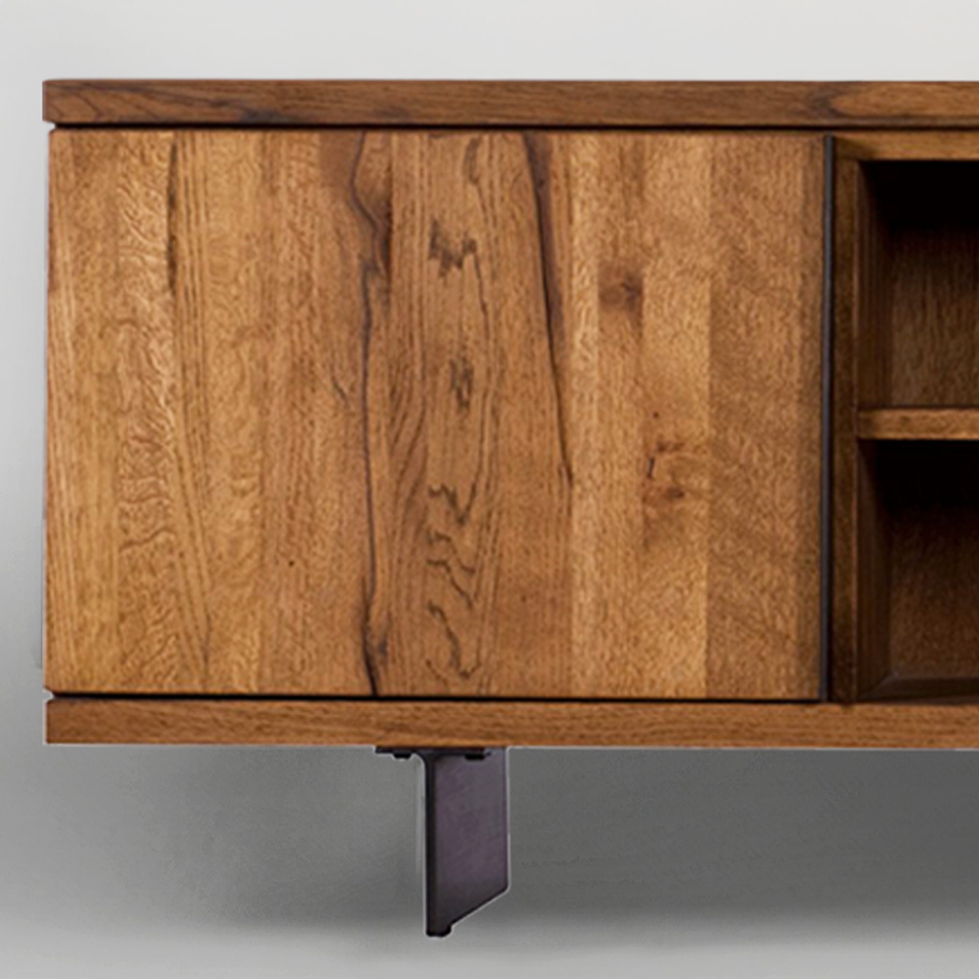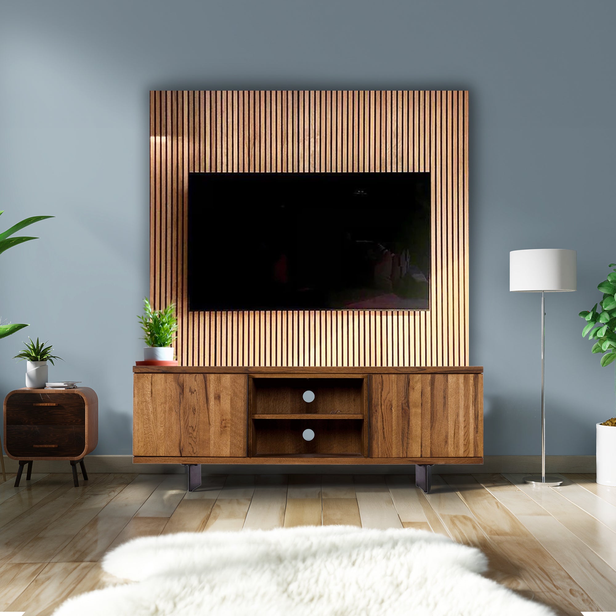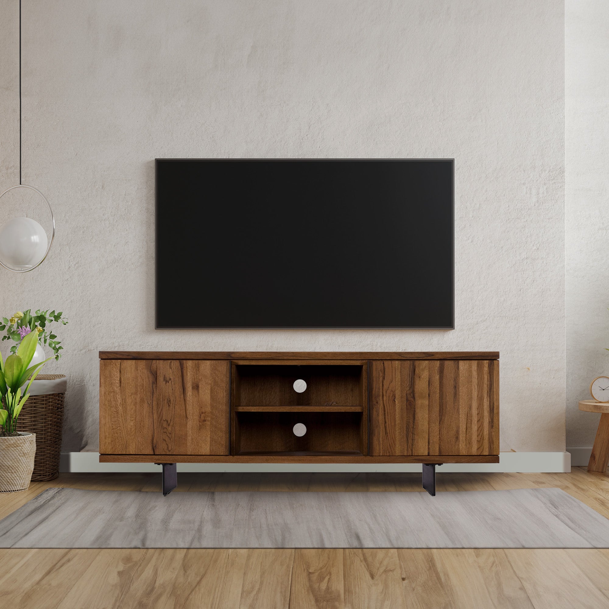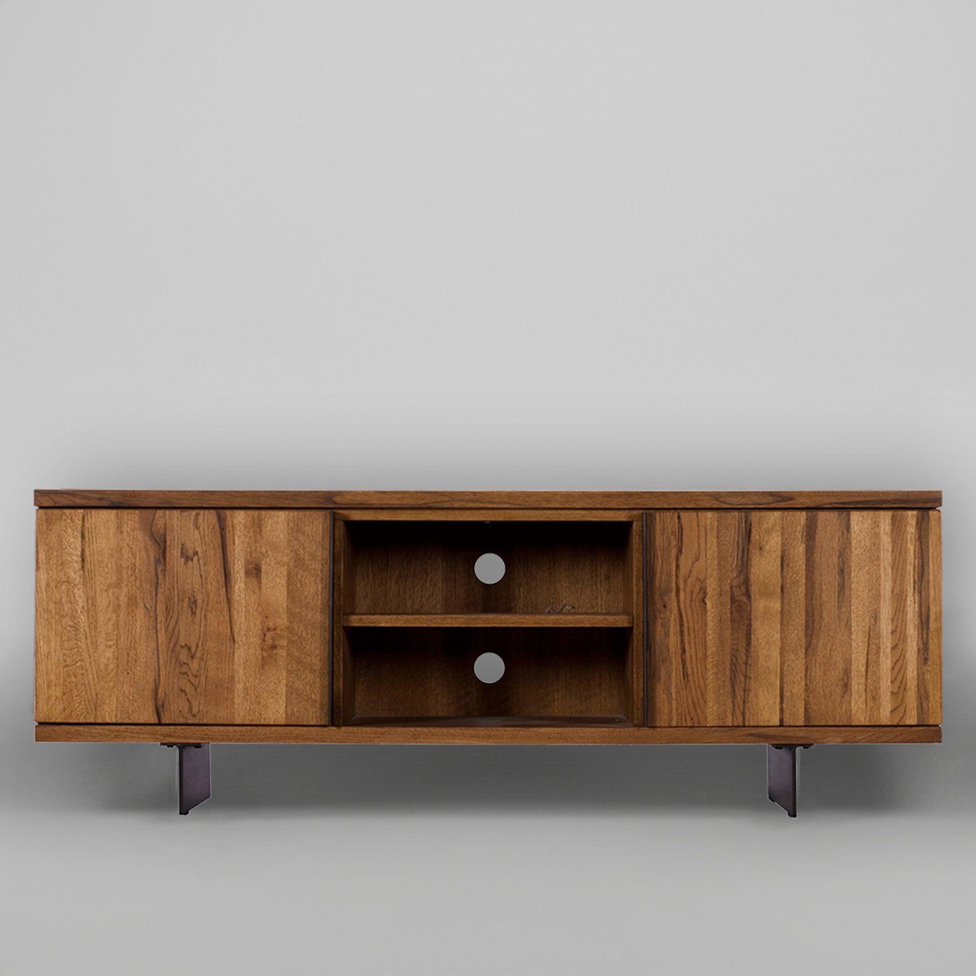 Give your living room a stylish centrepiece of furniture by adding this Mitcham Industrial Oak Wood TV Stand to your room. The rustic wooden media unit is made using sustainably sourced oak and finished off with matt black steel legs. The wide TV cabinet manages to combine elegance with an industrial look all in one.