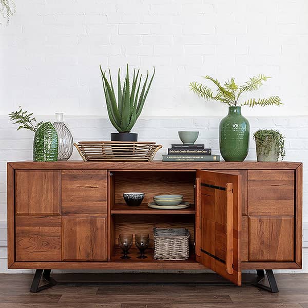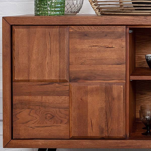 Discover rustic oak wood furniture with the perfect blend of unique style and unbeatable practicality with the mesmerising Mitcham Large Retro Industrial Sideboard. The wooden sideboard cabinet has been luxuriously handcrafted using solid oak and has been finished off with squared features on the cupboard doors for a unique, Bohemian feel that will complement rustic furniture perfectly. The storage chest is finished with black steel angled legs for a slight retro finish which really adds to the Boho look of the piece. If you have been hunting for the perfect large sideboard, look no further than this beauty.