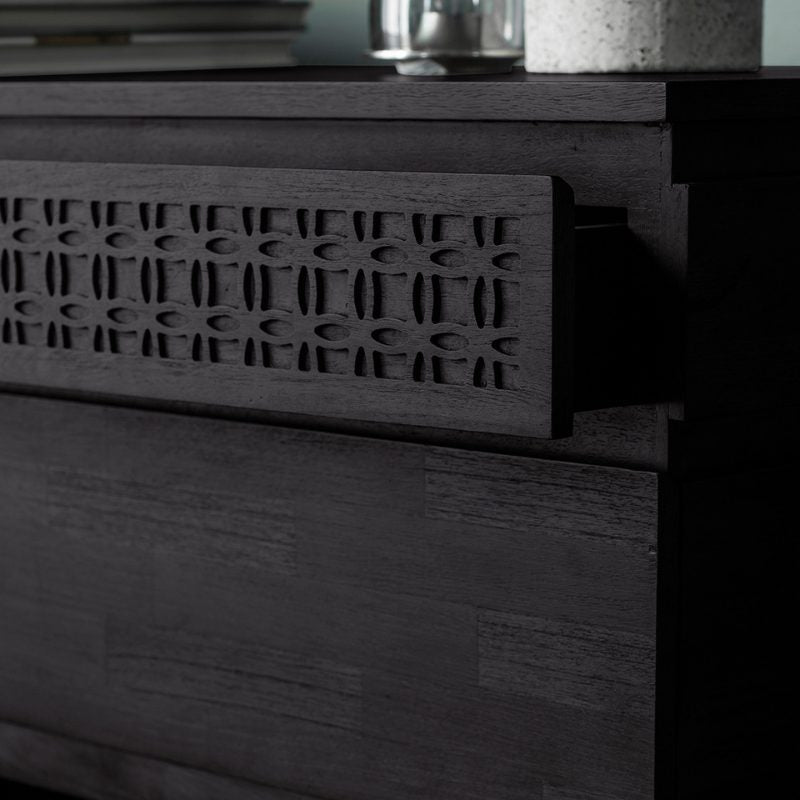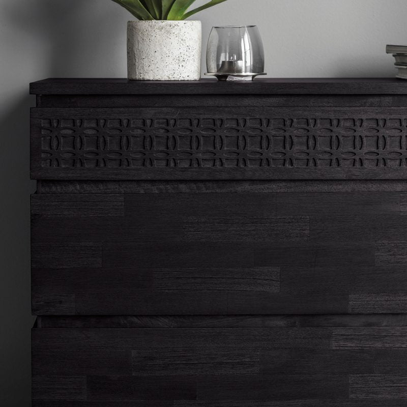 Estimated Delivery 2-4 Weeks. The Netherbury wooden chest of drawers is part of our enticing Newbury range. This beautifully made mango wood chest of drawers features a detailed carved top drawer with three spacious drawers underneath. Combine with modern or classic pieces to create a truly eclectic 4 drawer chest. Assembly Required.