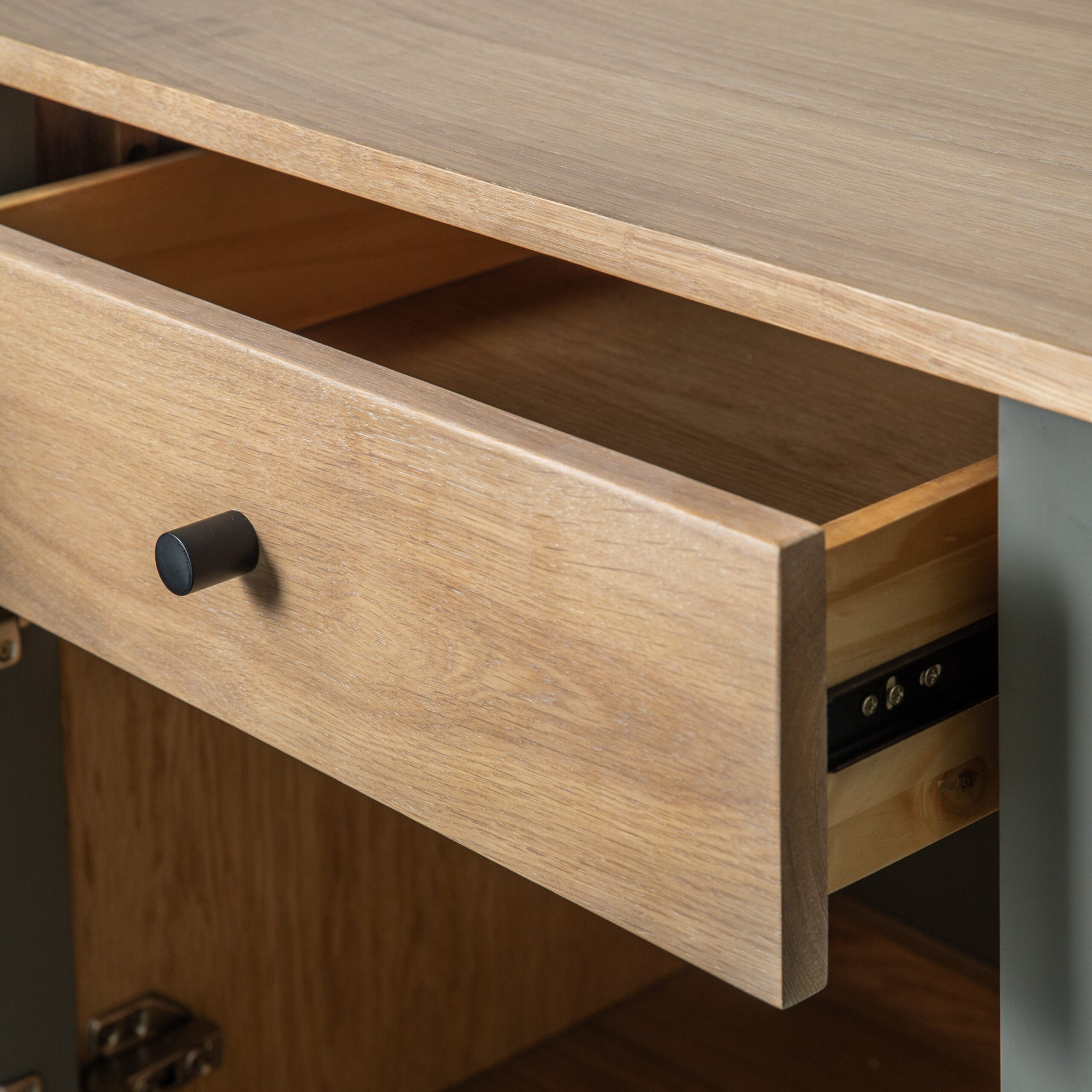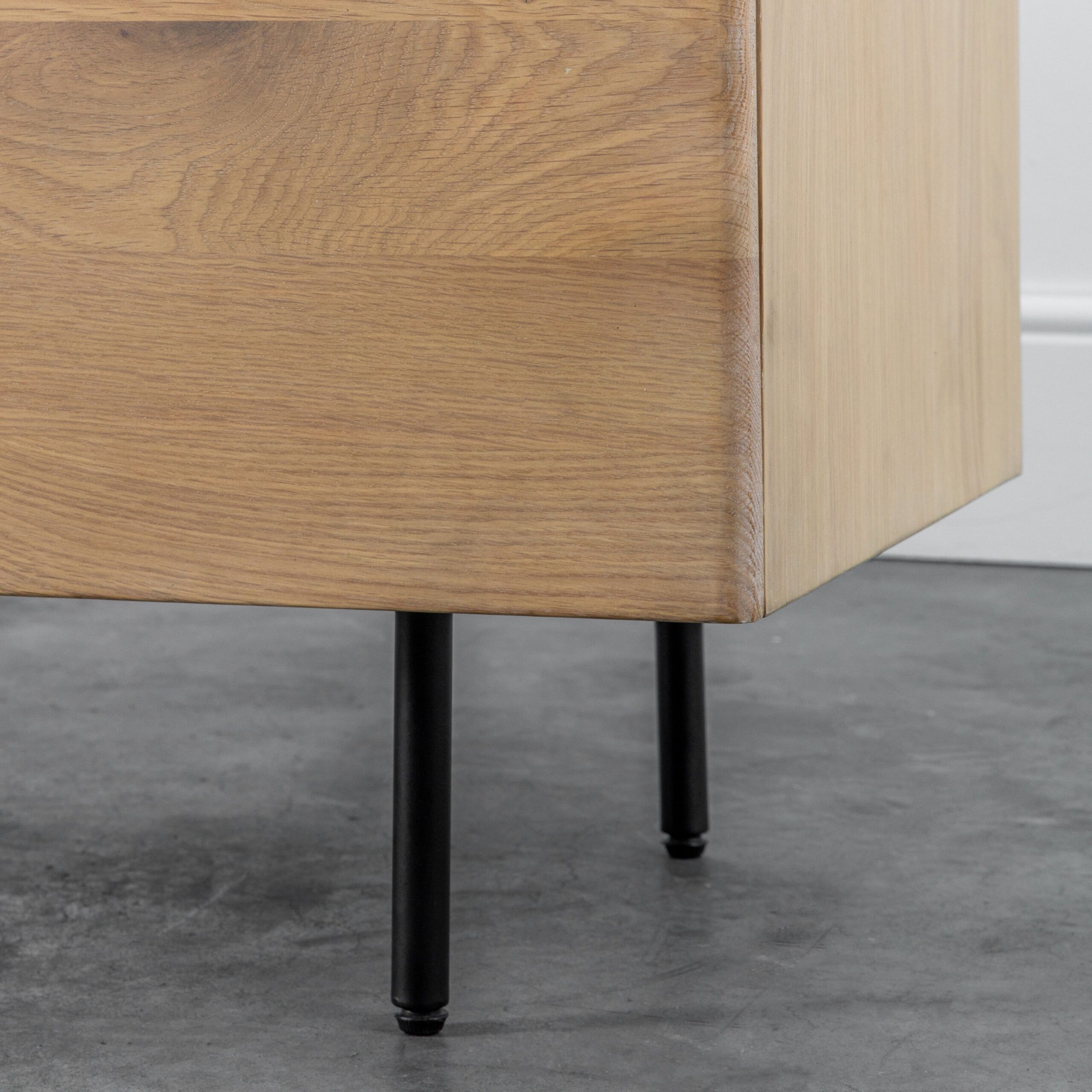 The Okayama 2 Drawer 2 Door Sideboard features solid oak drawer fronts with routing detailing to echo the slats on other pieces in the range. Radius detailing up the edges of the cupboard doors and drawer fronts adds a classy high-quality finish. Slim black metal legs and matching handles complete the look.
