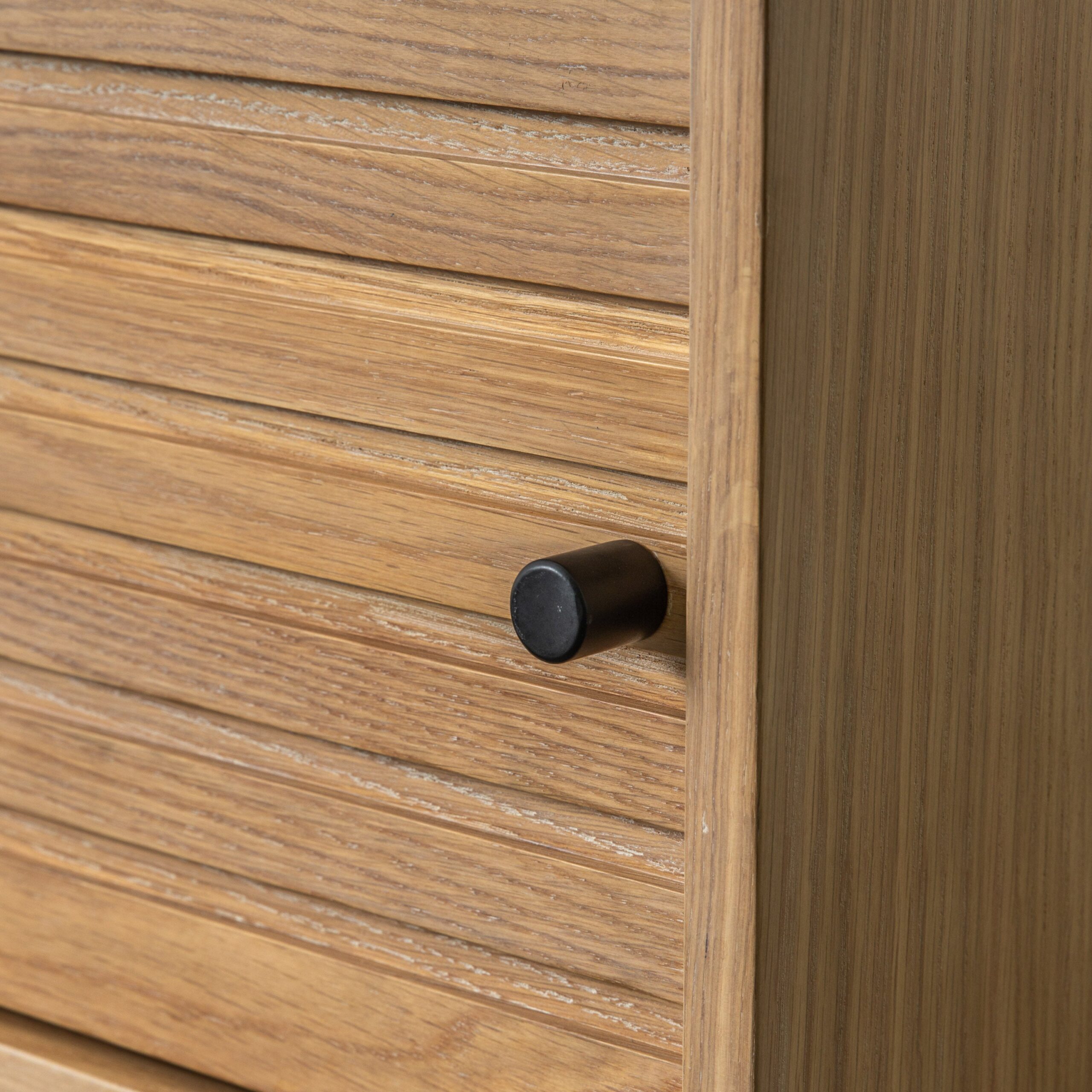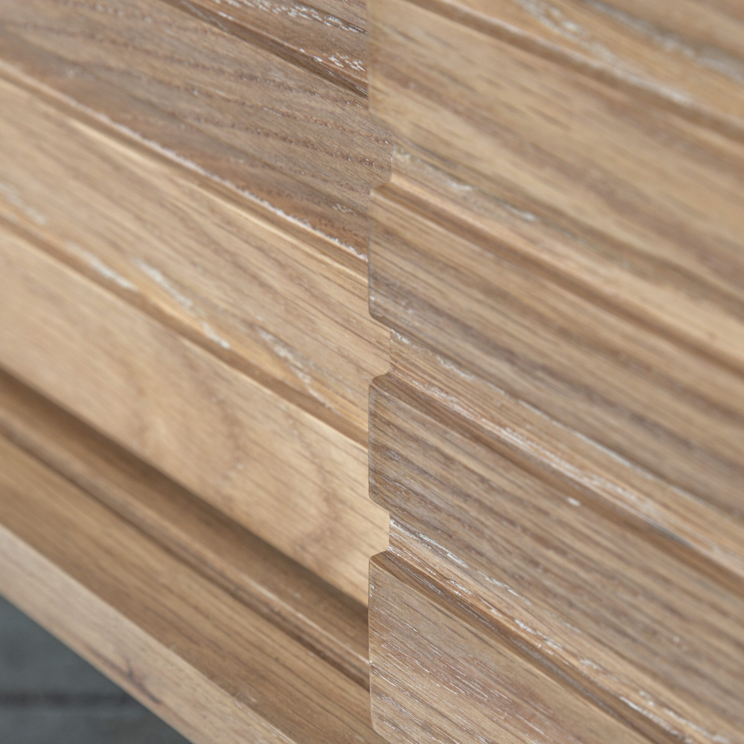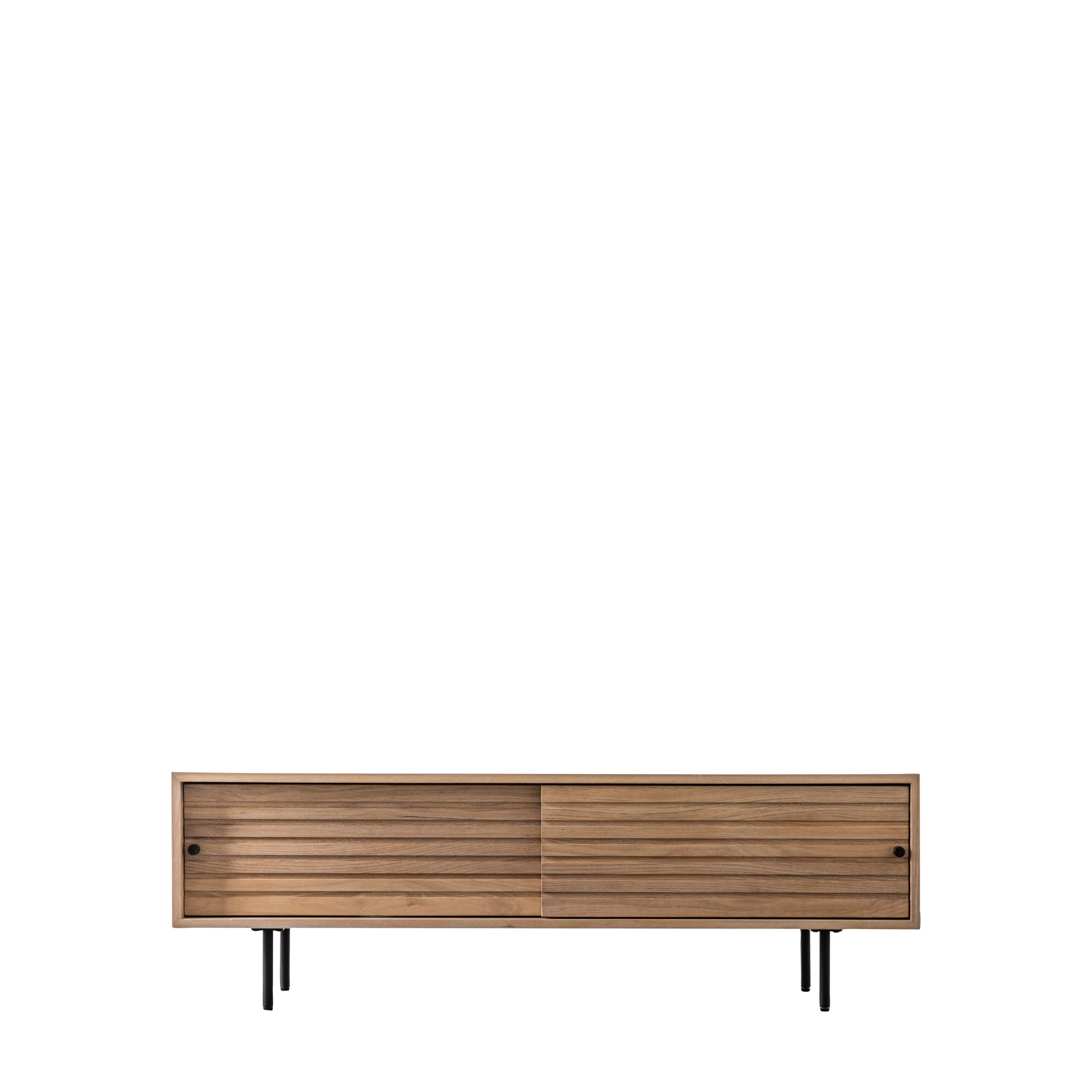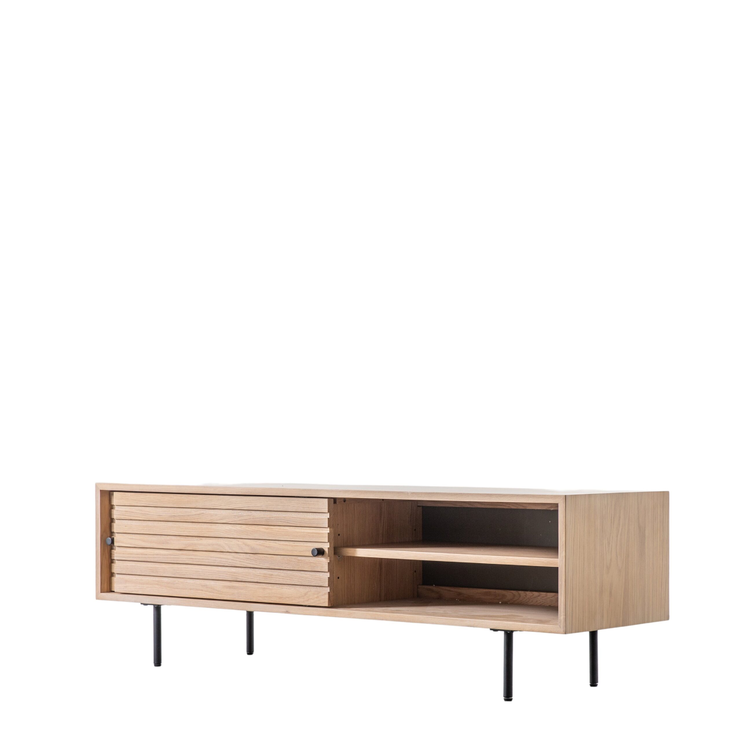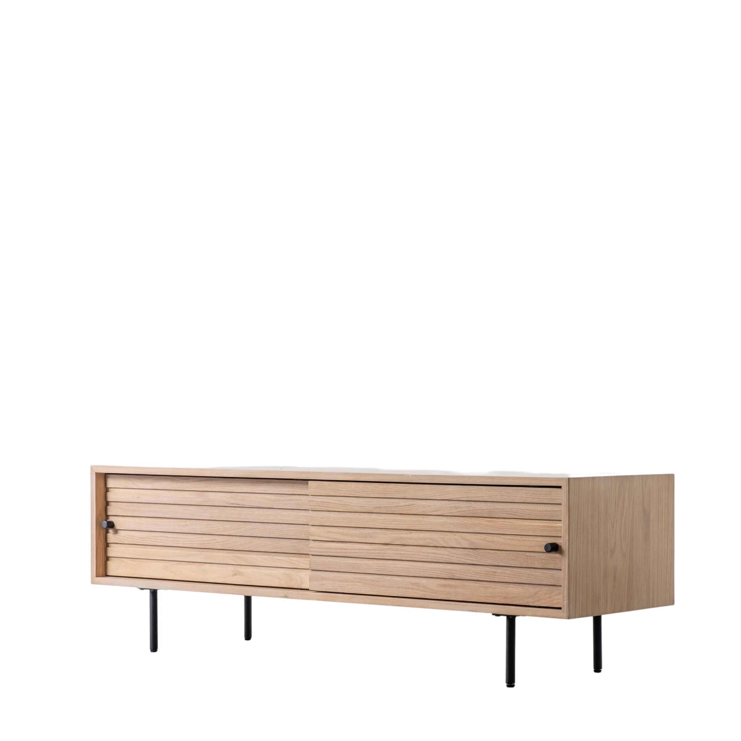 The Okayama Media Unit features sliding doors crafted from solid oak with routing detailing to echo the slats of other pieces in the range. Black metal legs and handles add the finishing touch.