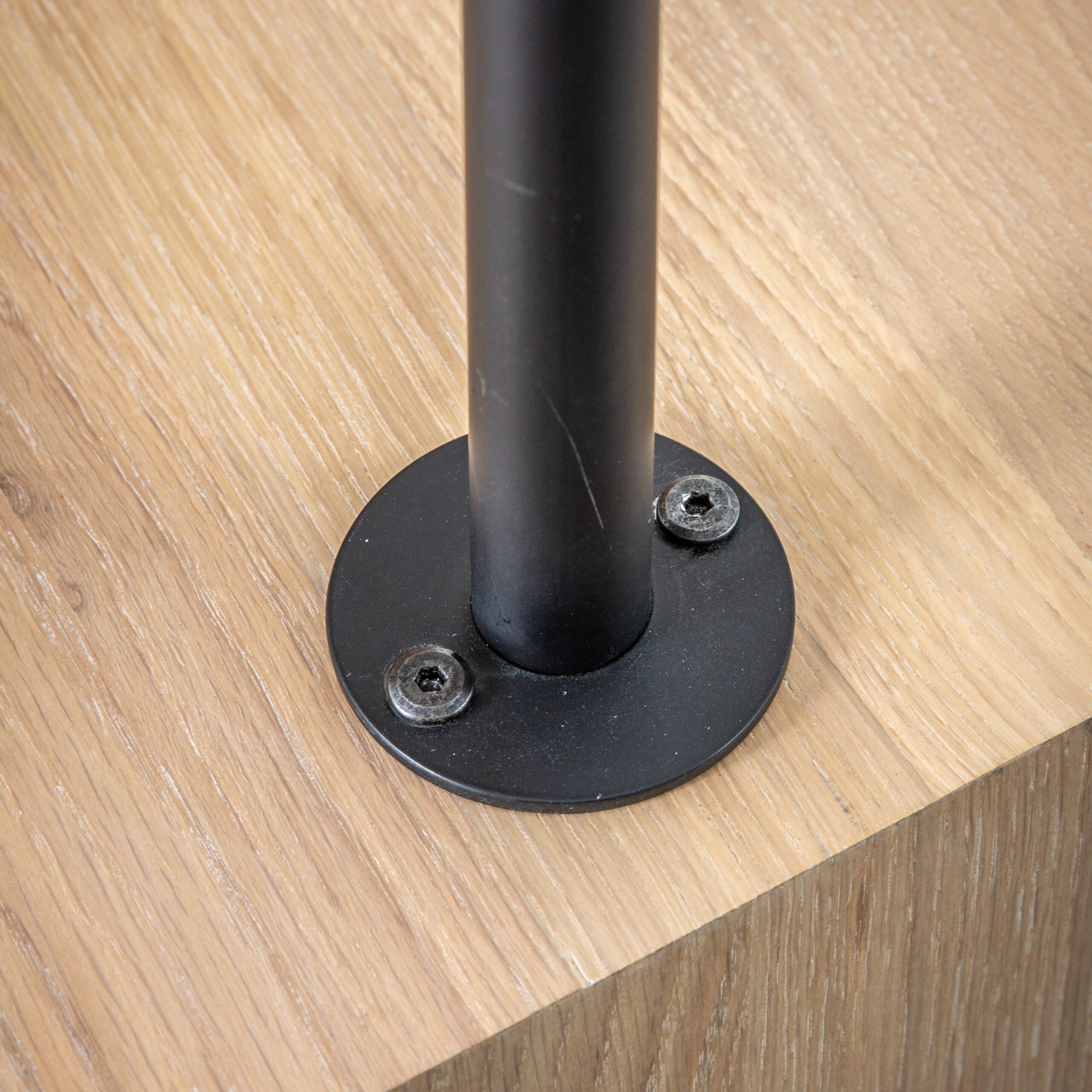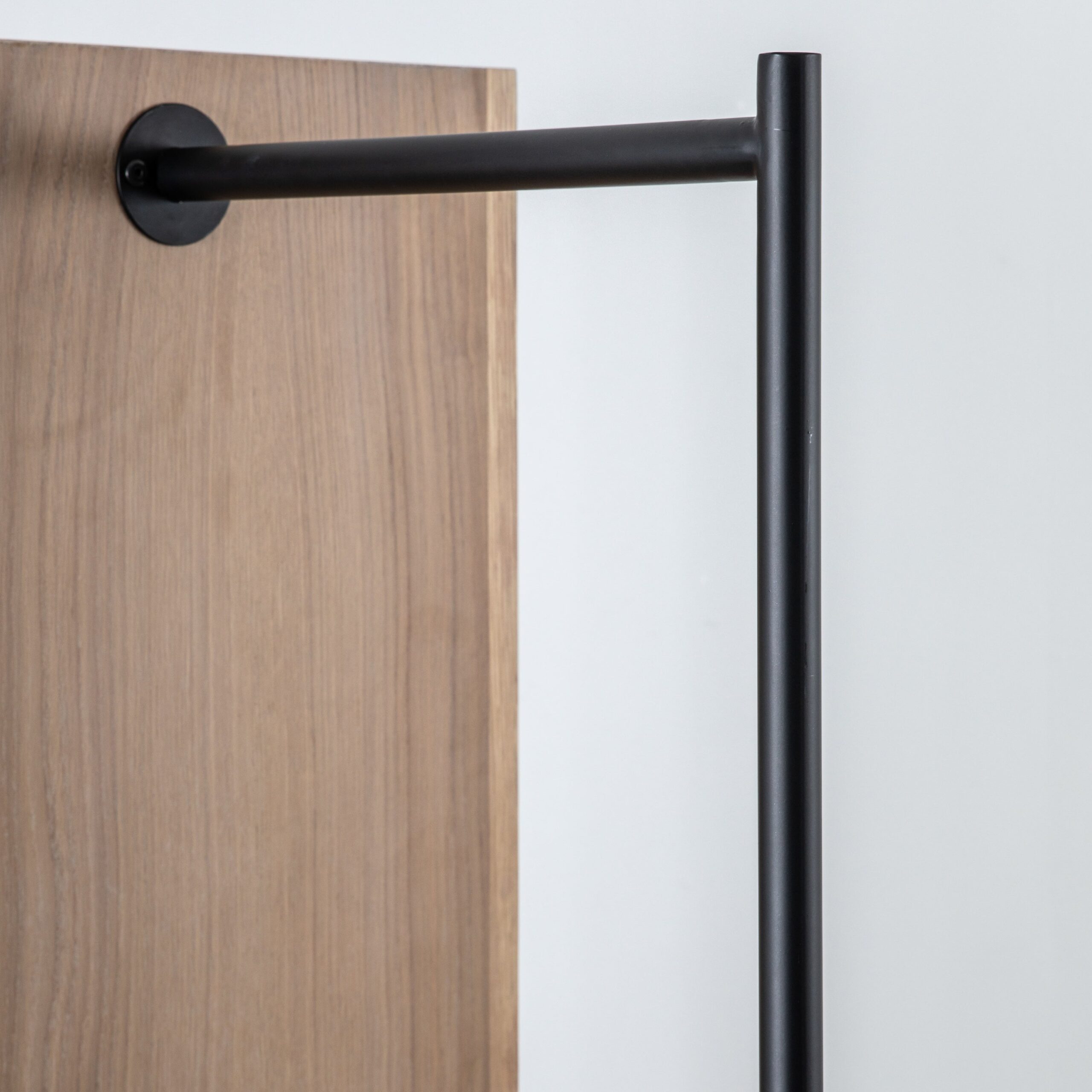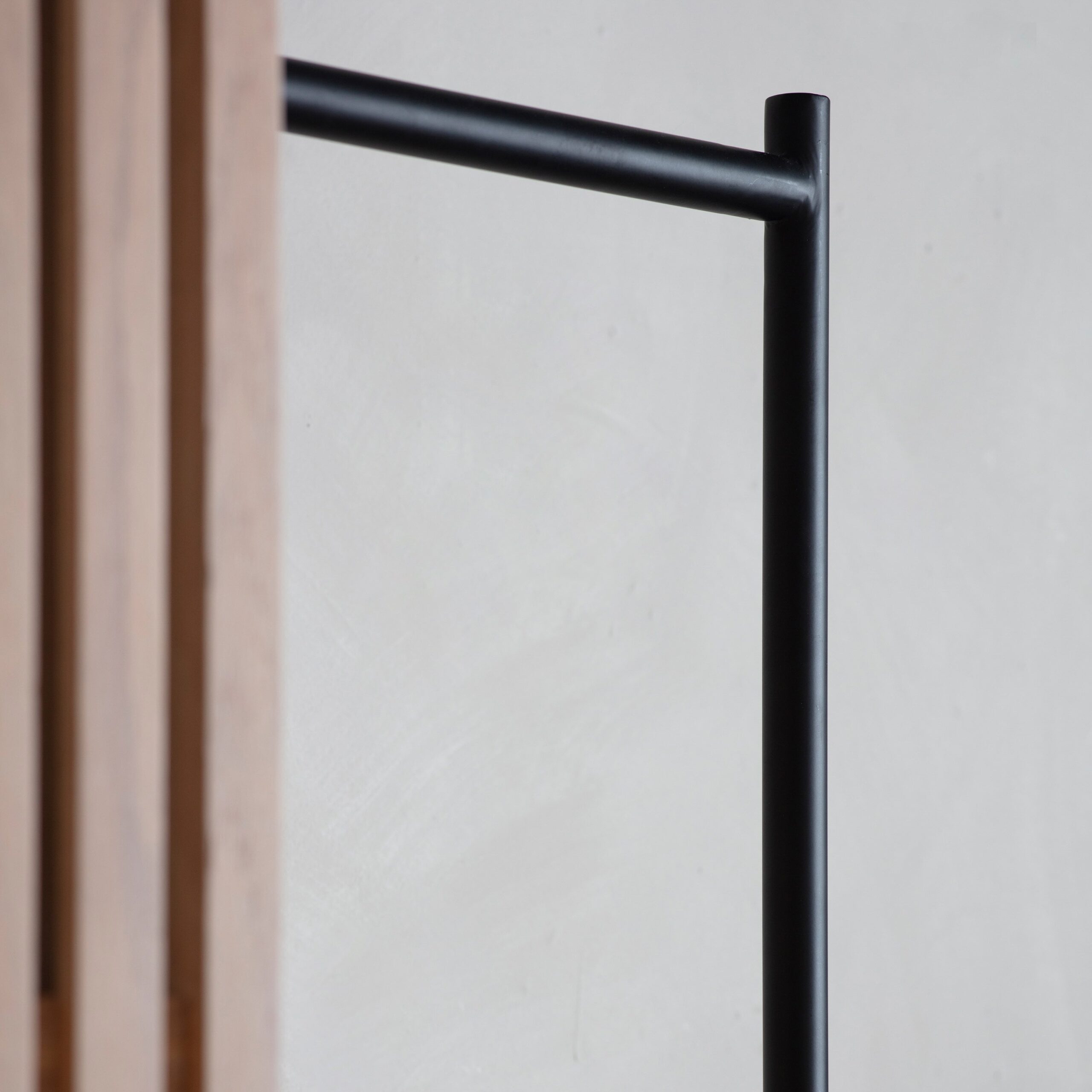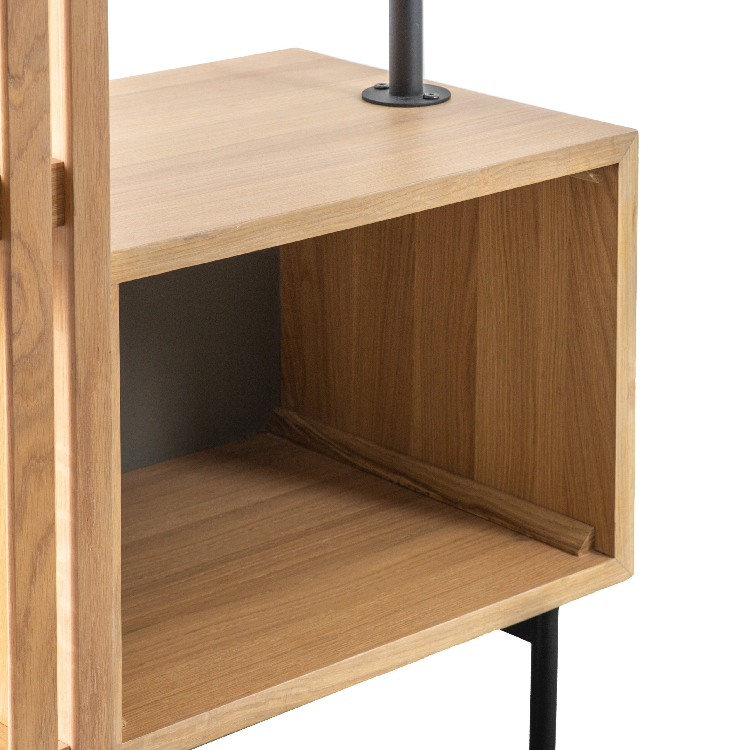 The Okayama Open Wardrobe features solid oak slats with four shelves behind, plus another open shelf on the front of the unit. A black metal hanging rail offers practical storage, with matching black metal legs adding the finishing touch.