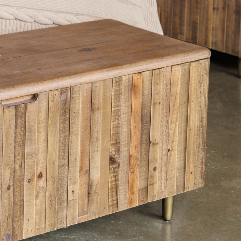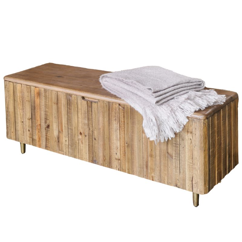 Complete your farmhouse bedroom scheme with this stylish storage chest crafted in 100% reclaimed wood. Handy for storing so much more than just blankets, throws and bed linens, a wooden blanket chest is a versatile piece of bedroom storage that can adapt and change to your needs throughout the seasons. The contemporary shape and smooth curved corners of the Onslow wooden blanket chest allow the woodblock design to heighten the character of its reclaimed features, while the slim but deep proportions make it ideally suited for the foot of the bed or tucked under a window. Pair this rustic blanket box with other pieces from the Onslow Bedroom – Reclaimed Wood collection to complete the look.