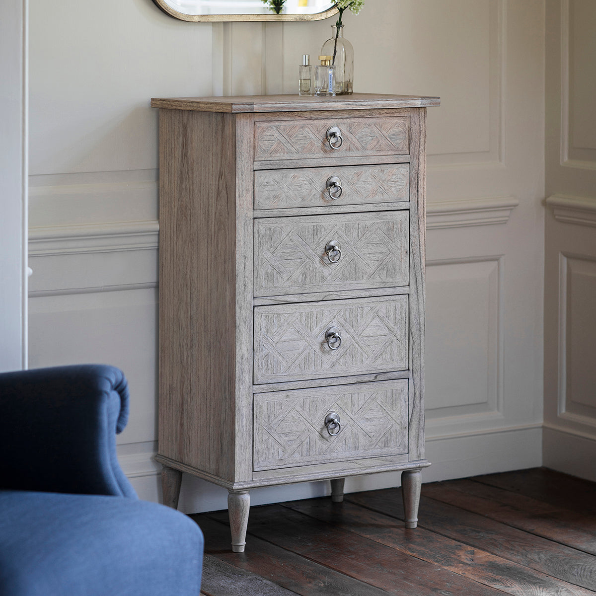 Beyond its visual appeal, the Tallboy is also highly functional, offering generous storage space across its multiple drawers. Elevate the elegance and utility of your space with the Parquet Tallboy, a true testament to fine craftsmanship and style.