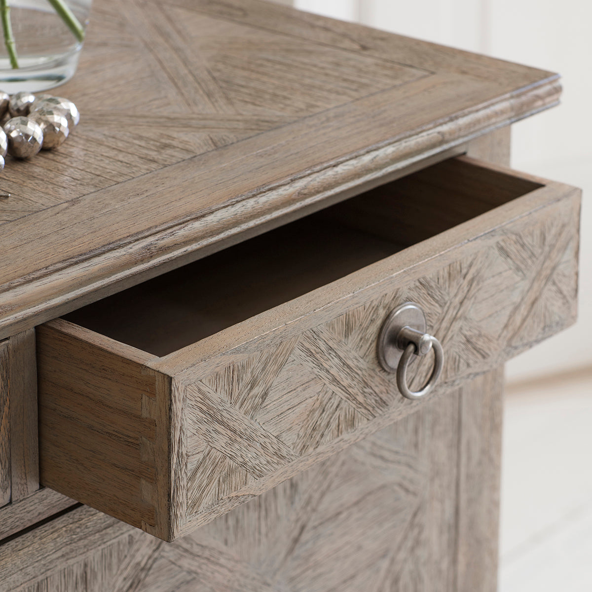 The Parquet collection is crafted from Mindy wood, with a finish that’s subtly brushed to evoke the charm of a beachside veranda that’s gracefully aged under the sun and sand. The design, bearing hints of French Colonial architecture, seamlessly integrates with contemporary interiors as well.