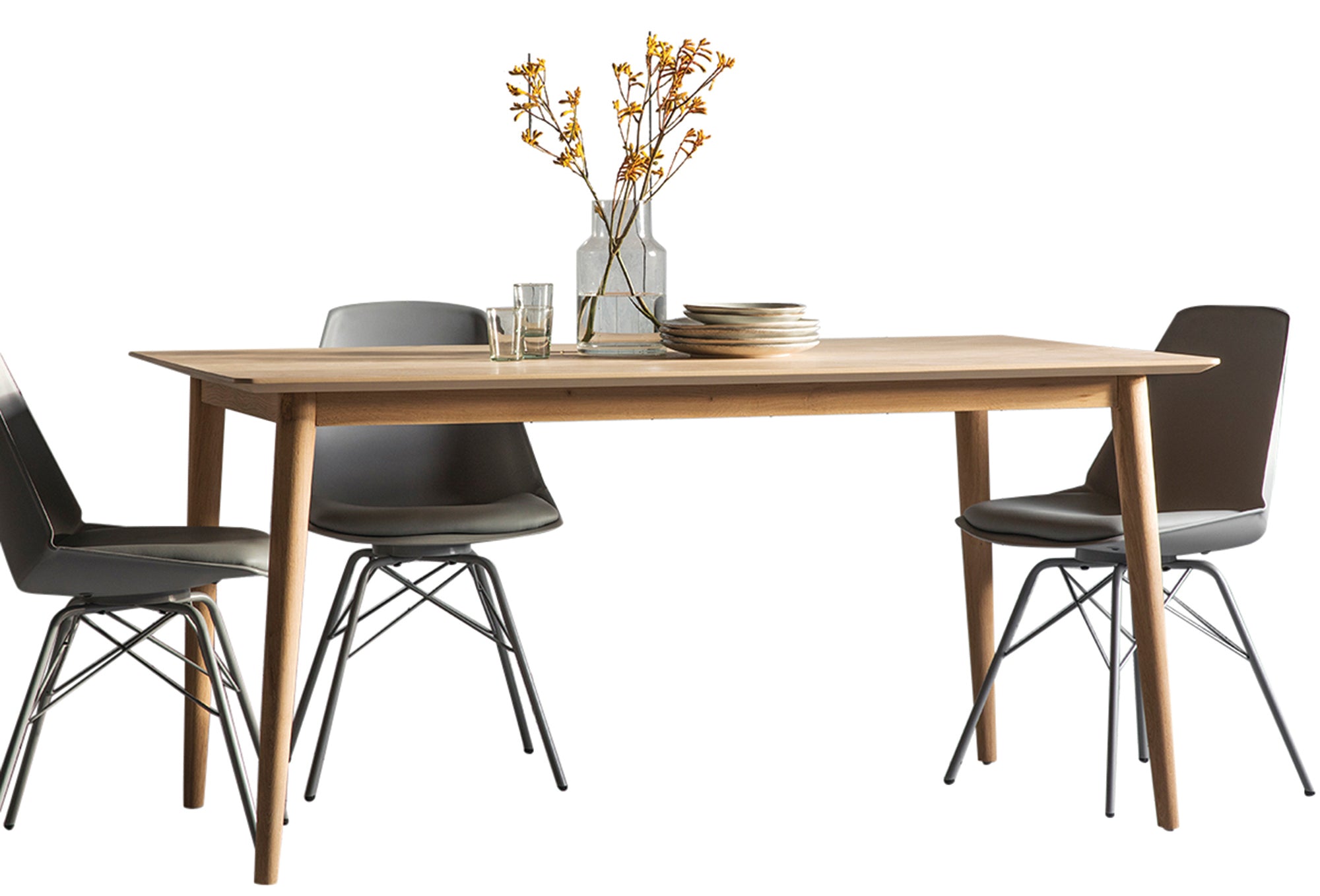 The elegant Skandi Dining Table boasts a captivating inlay chevron design, meticulously crafted from European oak and complemented by rustic oak structured veneers, highlighting the inherent beauty of the oak grain and knots. Treated with a specialist matt lacquer, the timber maintains its organic, dry appearance, with the brushed-out grain offering a tactile sensation, making the table both a visual and tactile delight.