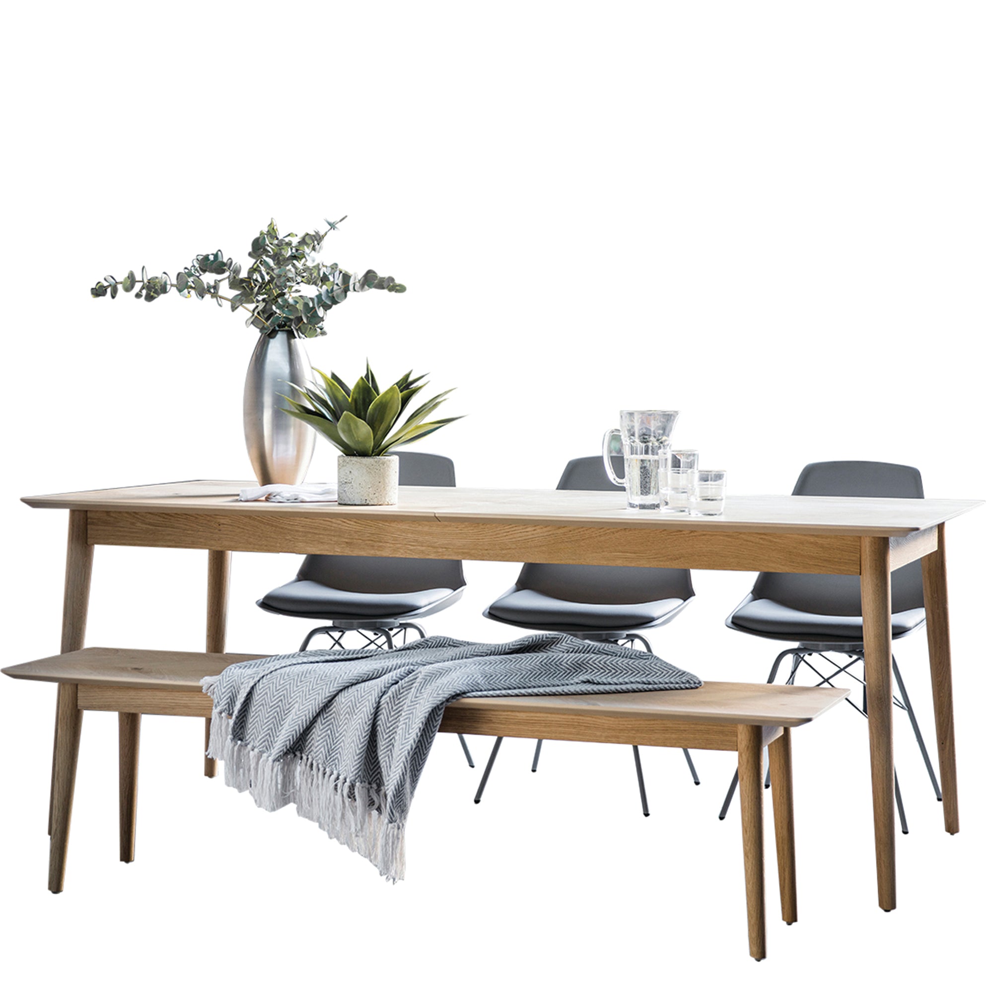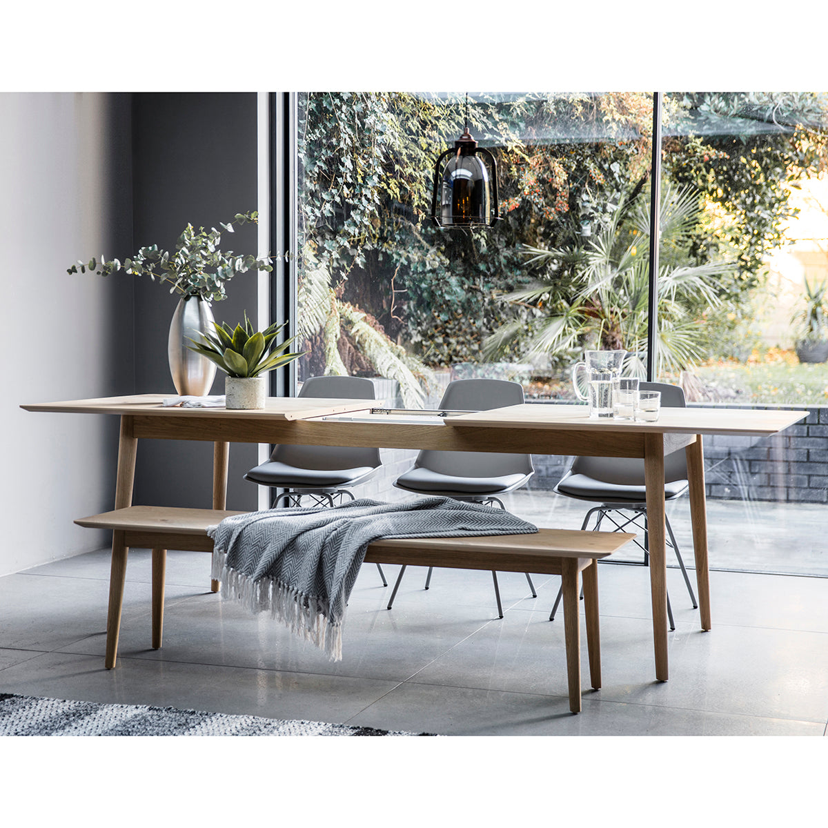 The exquisite Skandi Extending Dining Table, with dimensions ranging from W 2000-2520, showcases a captivating inlay chevron design. Meticulously crafted from European oak and enriched with rustic oak structured veneers, it highlights the innate beauty of the oak grain and intricate knots. Treated with a specialist matt lacquer, the wood preserves its organic, dry appearance, accentuated by the brushed-out grain. Beyond being a visual masterpiece, this table also offers a tactile experience, making it a centrepiece for any dining setting.
