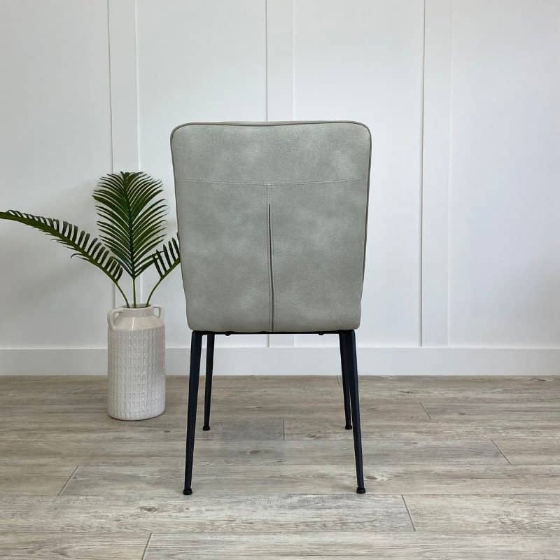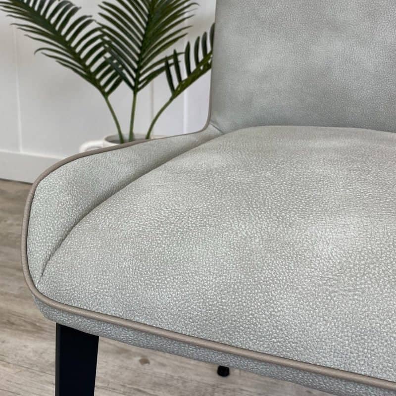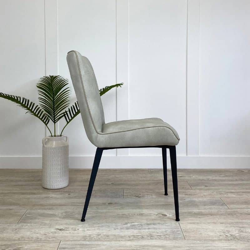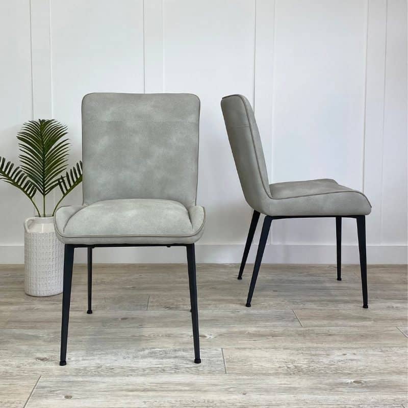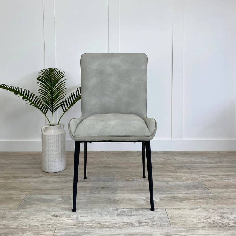 Bring some added elegance to your dining table with these beautifully soft faux leather chairs. The timeless design of this modern dining chair ensures it will fit with all types of dining spaces and dining tables from contemporary to rustic. Expertly crafted in the softest, yet most durable, PU leather, the Skye upholstered dining chairs are available in a choice of three muted hues. For grey faux leather dining chairs choose Storm and mix with Cloud and Dusky Blue coloured dining chairs to brighten your interiors. We particularly like the contrasting piping around the edge of the contemporary dining chair and the slender powder-coated black metal legs that provide stability and style.