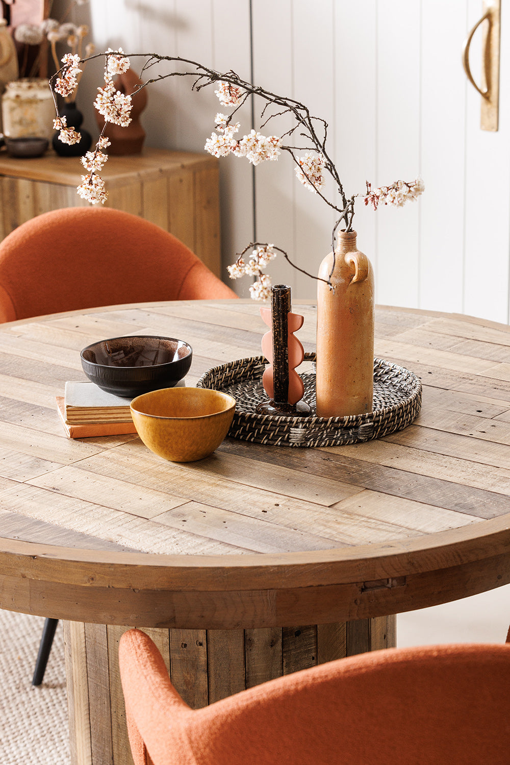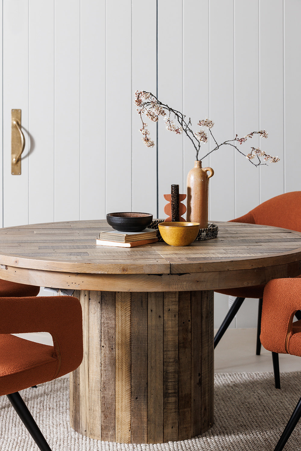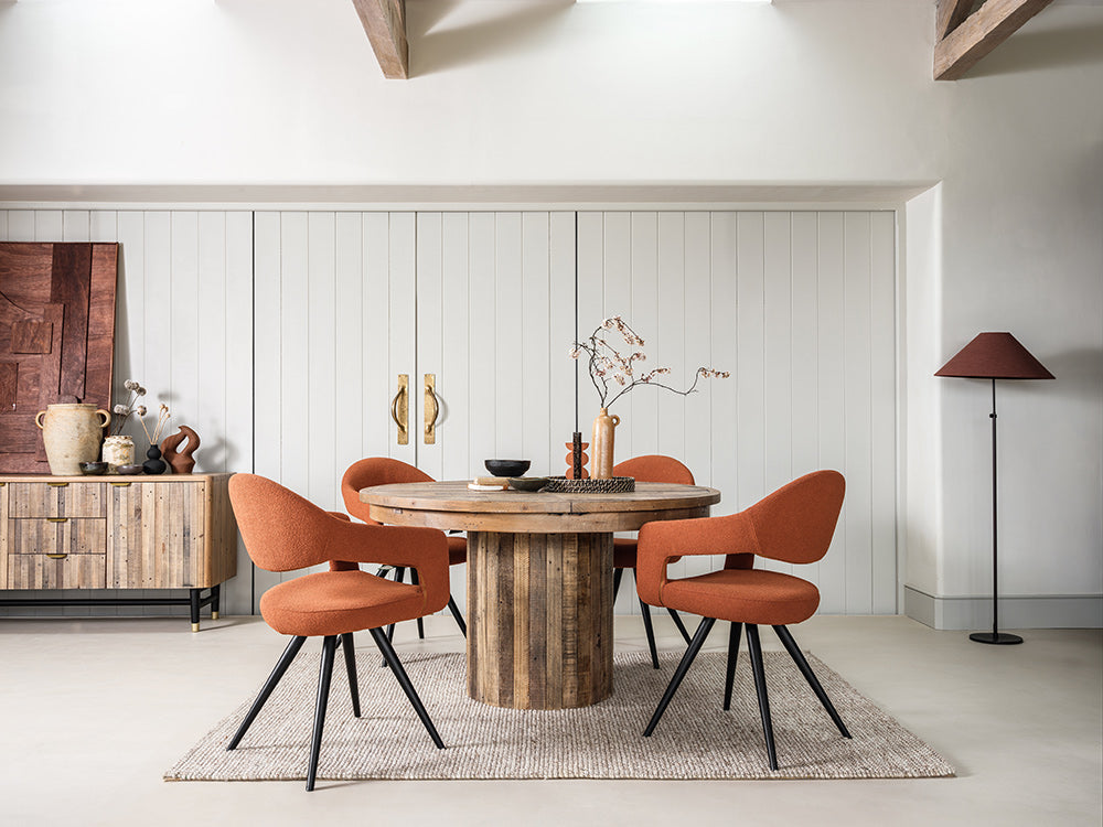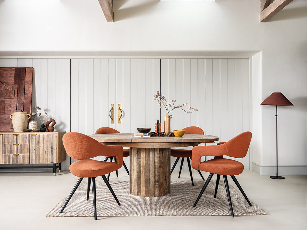 This Skyline Extending Round Dining Table offers versatility and elegance. Its circular design is perfect for intimate meals, and when extended, it comfortably accommodates additional guests. The reclaimed wood top and sturdy base provide a durable, stylish surface for any occasion.