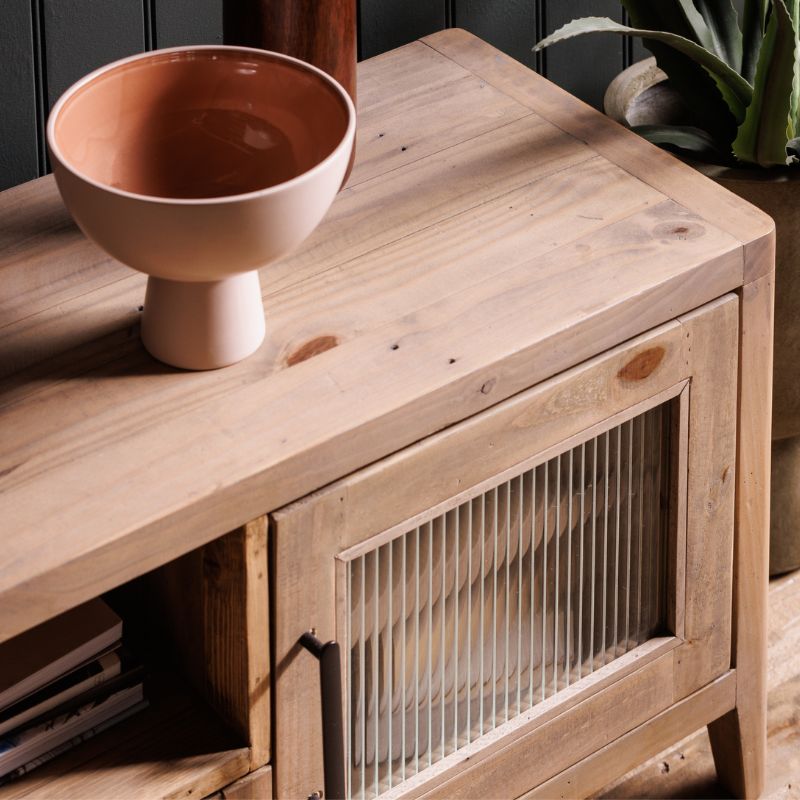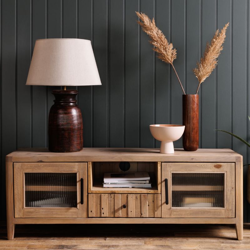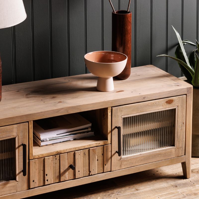 For spaces wanting to channel a chic rustic style, this beautiful reclaimed wooden soho TV unit will fit in nicely. Part of the Soho reclaimed wood furniture collection, this large tv stand features two handy cupboards with reeded glass doors, a drawer with an eye-catching rustic woodblock design and a middle shelf, along with a practical cable port in the back providing plenty of storage to hide clutter. When you bring reclaimed furniture into your home you are owning a one-of-a-kind piece. Each piece bears its own individual characteristics with unique marks and scars from its previous use, whilst the wood has its own variation of tone and colour. Pair this solid wood tv unit with other items from the Soho collection, including a large sideboard, for a wonderfully modern rustic look.