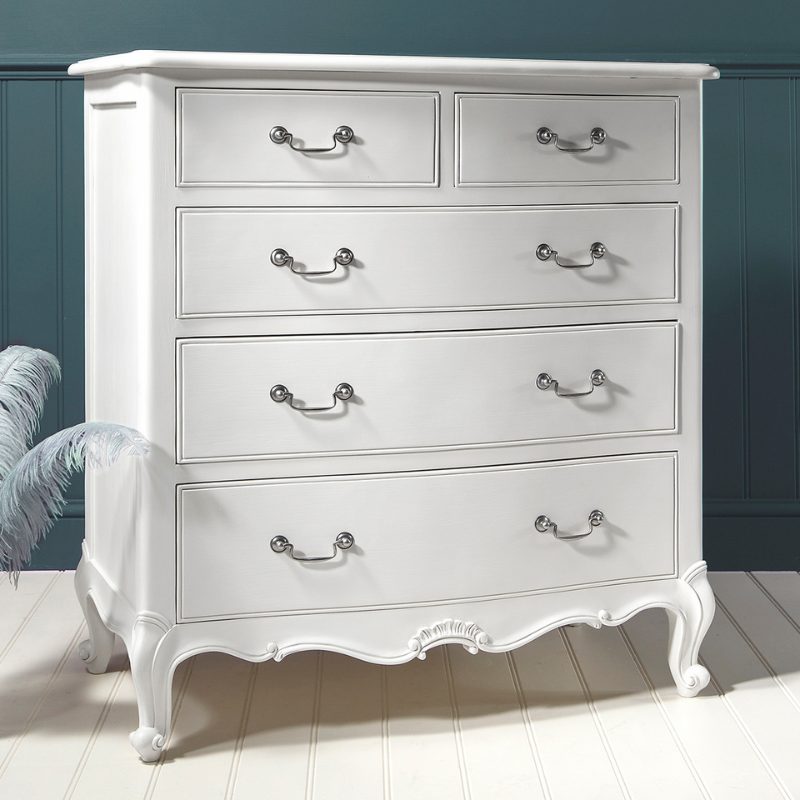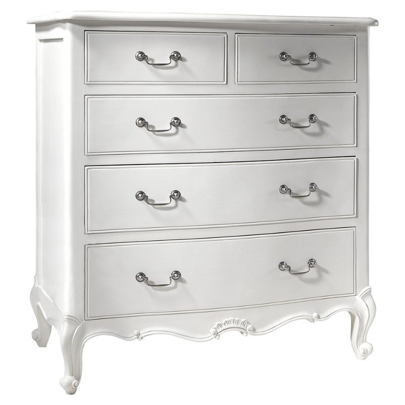Estimated Delivery 2-4 weeks.This elegant wooden chest of drawers is part of our chic Southleigh range with various colour options to match other pieces in the range for a coordinated look. This stylish solid wood chest of drawers features three large drawers with two smaller drawers at the top offering plenty of space for clothes and other bedroom essentials. The hand-carved detailing of this 5 drawer chest is a timeless addition that will never go out of style.