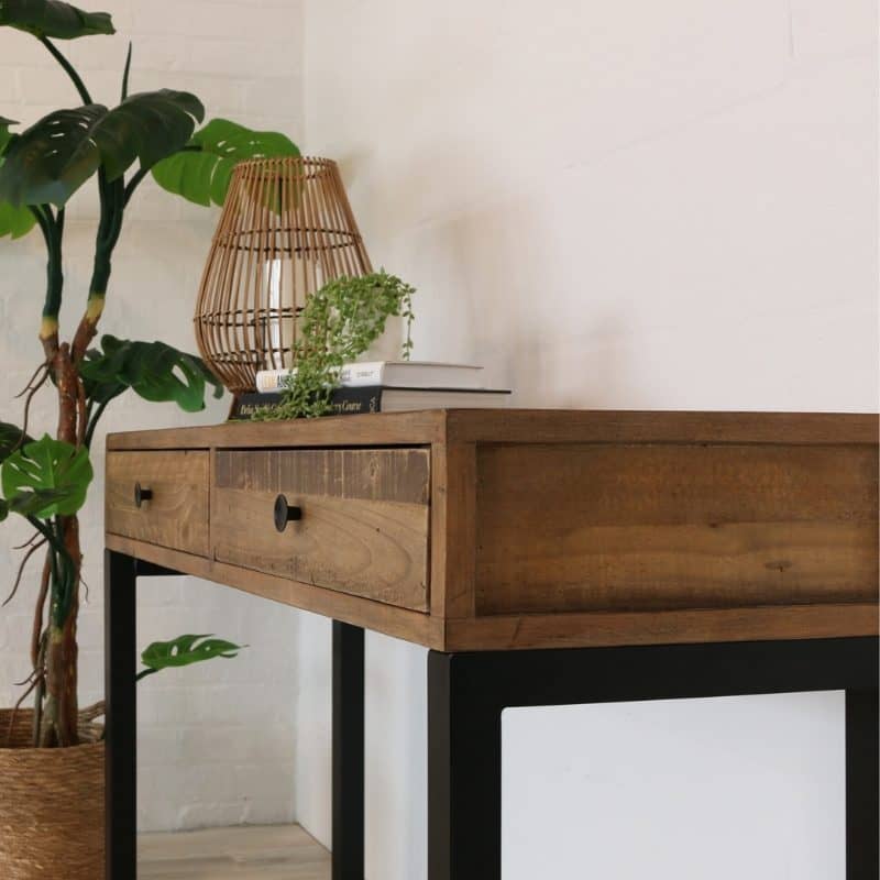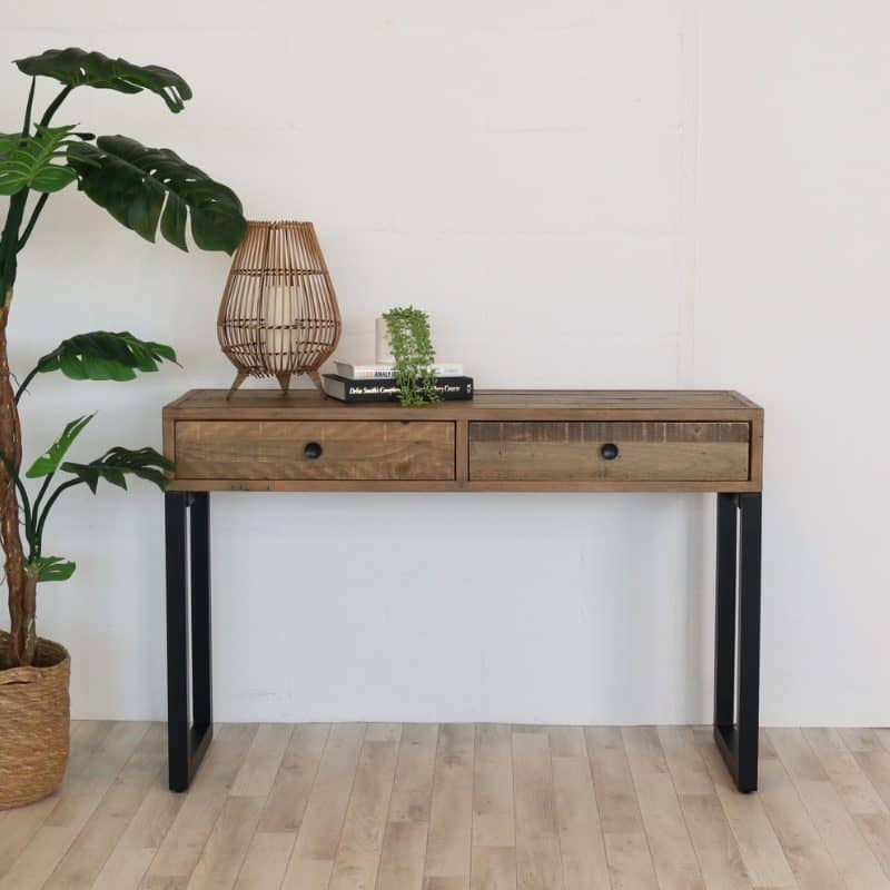 Luxury handcrafted console table made using 100% reclaimed wood with distressed black steel nixon legs. The Standford Industrial Console Table comes with two drawers and is perfect for design-led homes wishing to make a statement in their homes.