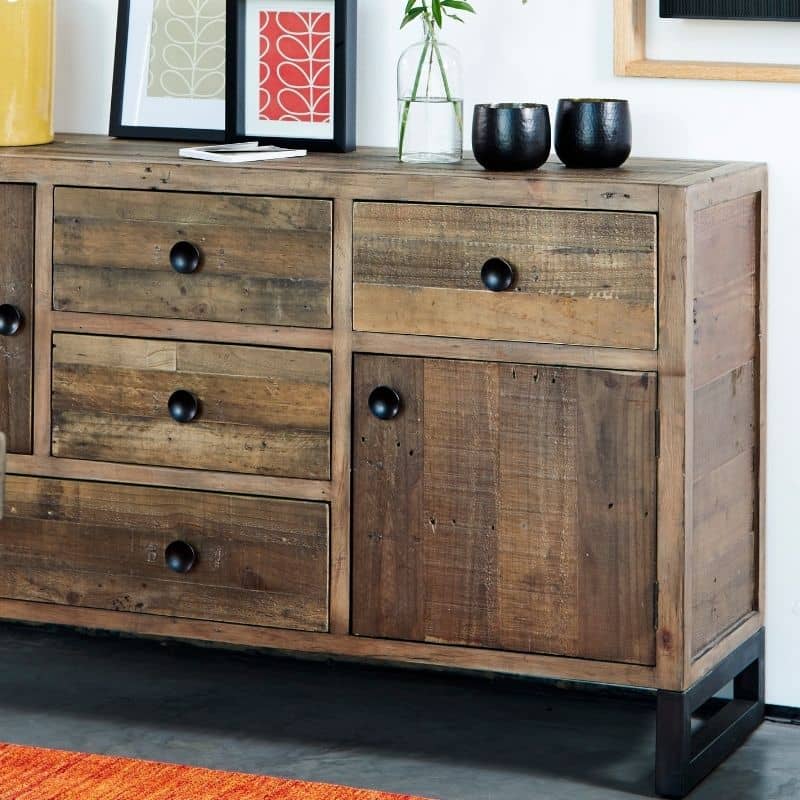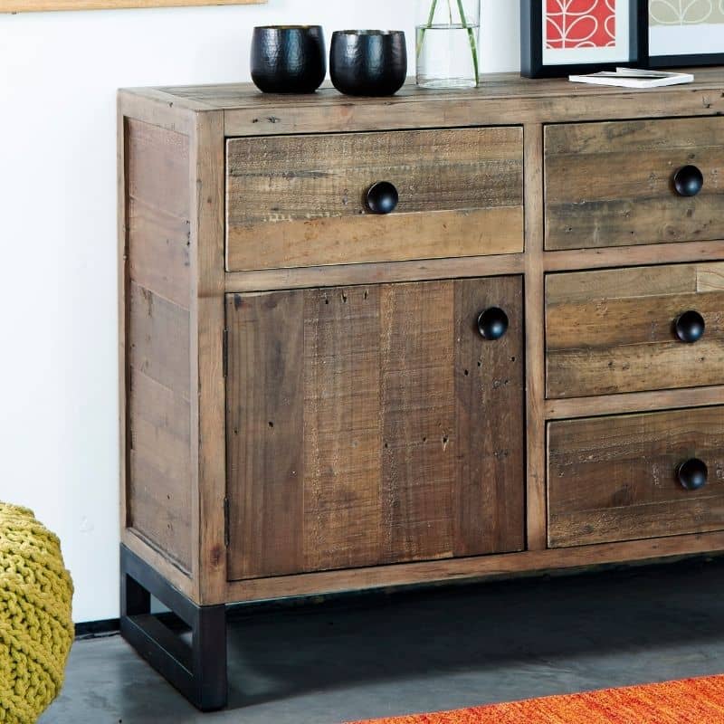 This industrial sideboard creates stylish extra storage for your home. Handcrafted using reclaimed wood, the Standford Large Reclaimed Wood Industrial Sideboard comes with two large doors and four drawers. The nixon distressed steel legs match the steel handles, giving you a solid piece of a wooden sideboard.