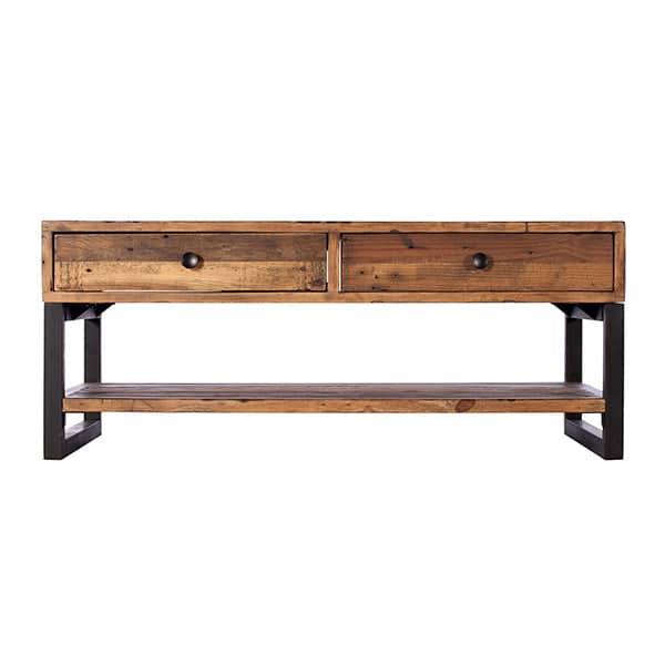 The perfect stylish coffee table for your home, made using reclaimed wood that’s been recycled from old buildings. The solid distressed steel nixon frame on this wooden coffee table complements the natural wood used, giving you a lifestyle statement piece of furniture for your home. Our distressed coffee table is made with two drawers and a large shelf, this rustic coffee table offers plenty of useful storage space.