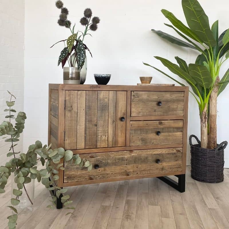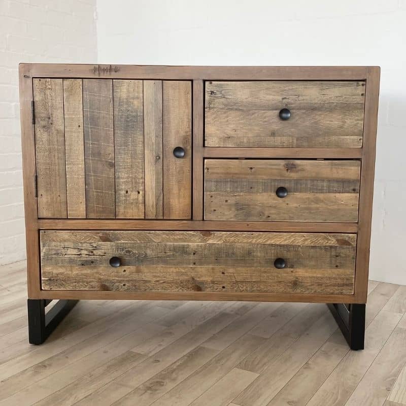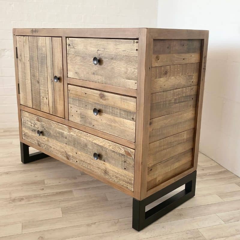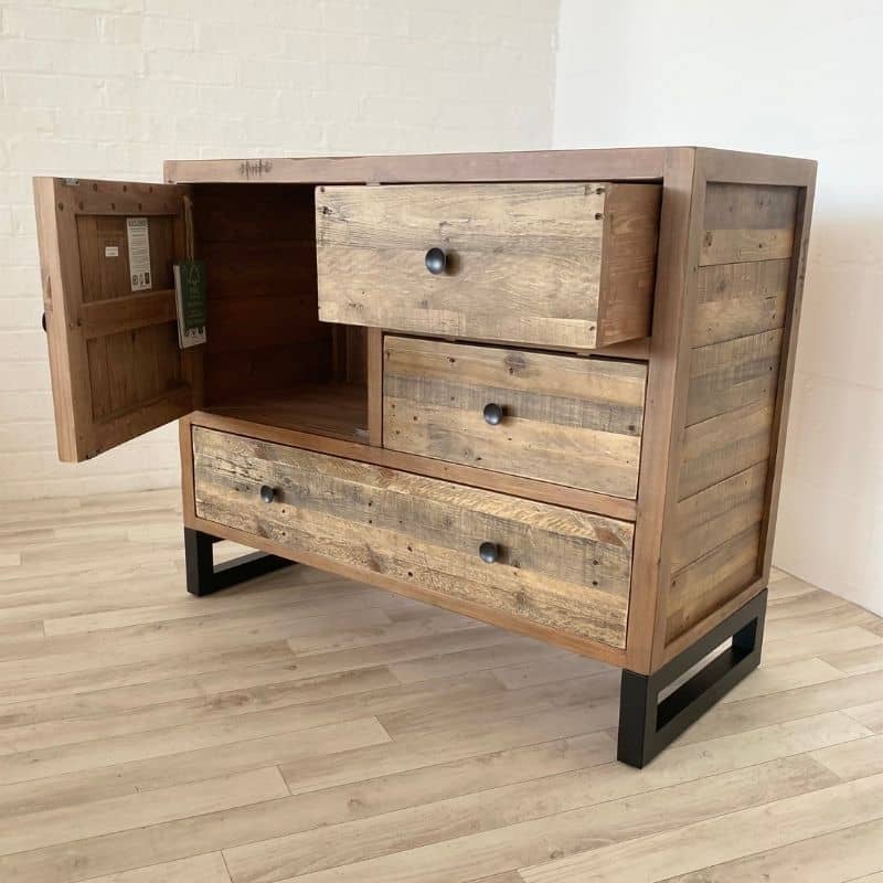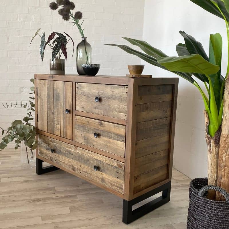 Stylish solid industrial sideboard, handcrafted using 100% reclaimed wood and nixon black distressed steel legs. The Standford Industrial Wooden Sideboard is a luxury item for your home, offering great storage space. The storage aspect of this piece is convenient for every day as it has been designed with three drawers and one cupboard.
