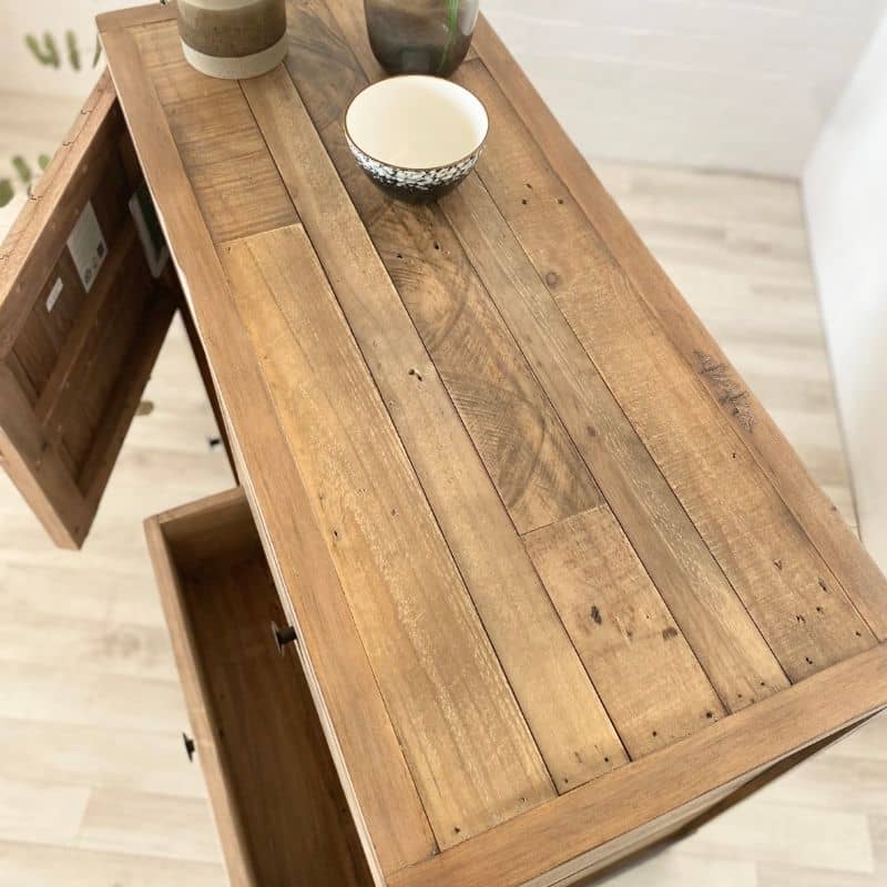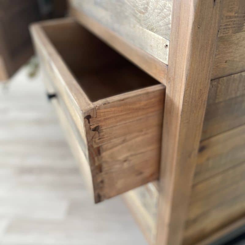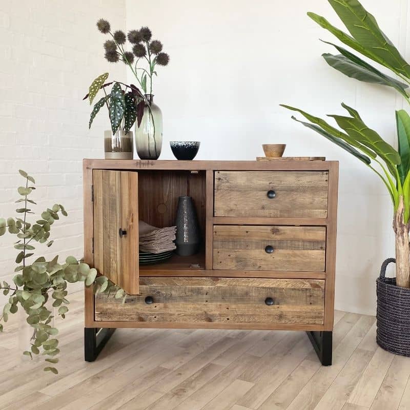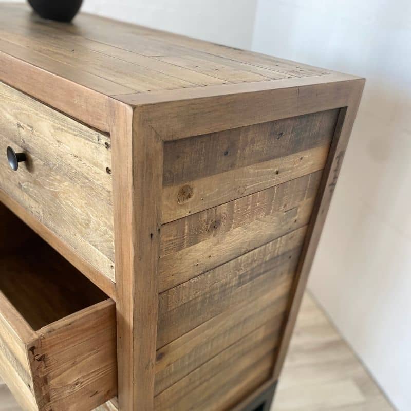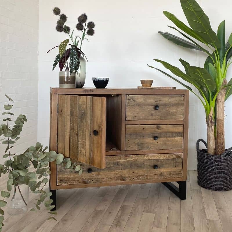 Stylish solid industrial sideboard, handcrafted using 100% reclaimed wood and nixon black distressed steel legs. The Standford Industrial Wooden Sideboard is a luxury item for your home, offering great storage space. The storage aspect of this piece is convenient for every day as it has been designed with three drawers and one cupboard.