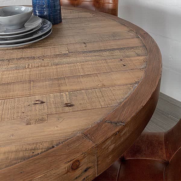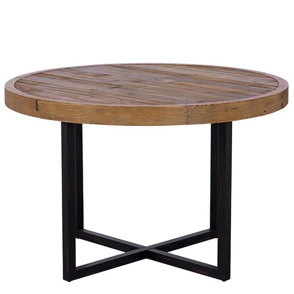 This stylish and contemporary round kitchen table is made using 100% reclaimed wood which is FSC Certified, the distressed black metal nixon frame completes the industrial look. The Standford Round Reclaimed Wood Dining Table is part of our Standford range, so you can add a sideboard or other items from the range to complete the look. The wood used for this small round dining table is full of markings and character from its previous use, as well as nail holes where old nails have been removed by hand. The different tones of the wood used make this a great choice if you are looking for a reclaimed wood dining table which is full of natural charm. This industrial round dining table is a great choice whether you are after a contemporary look and also works well in a more rustic style room.