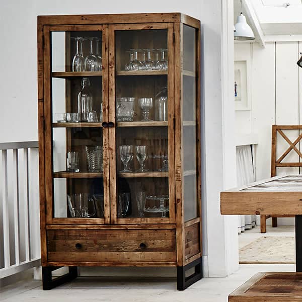 Add some extra storage to your home with a stunning glass display cabinet made from recycled wood. The Standford Wooden Glass Display Cabinet is handcrafted using 100% reclaimed wood. This wooden cabinet comes with one large drawer and four display shelves behind the double glass doors, the nixon black distressed metal legs add the industrial touch to this most stunning piece of furniture. The wood that’s been used to make this beautiful cabinet contains markings from its history and previous use, making every piece of furniture unique and special.