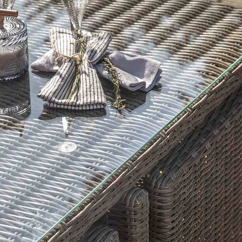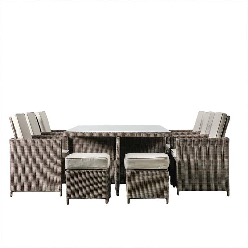 Dine alfresco this summer with the wonderful Torquay Rattan Cube Dining Set. Crafted in durable PE rattan, this versatile rattan garden dining set is big enough to seat 8 or 10 people, but compactly stores away when not in use as the stools and outdoor dining chairs neatly fit underneath the large square table. This rattan dining table and chairs comprise a set of garden armchairs each with backs that easily fold down to fit under the table, together with matching rattan garden stools. Thick showerproof cushions sit on top of the rattan chairs and stools in a choice of a natural off-white or soft grey colour adding extra comfort for lazy long lunches and dinner parties. The dining table of this rattan dining set is made from a strong powder-coated aluminium frame with a tempered glass top that sits on top of the beautifully woven PE rattan. Perfect for those wanting to maximise outside space this rattan outdoor dining set will be your favourite spot in the garden year after year. Assembly required.