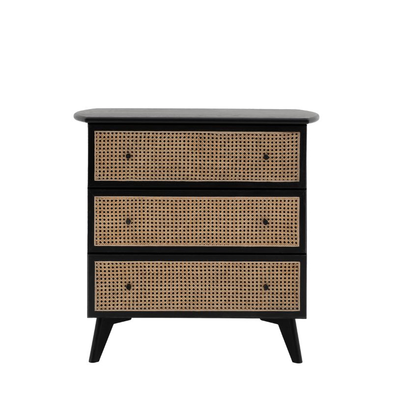 Estimated Delivery 2-4 weeks. The Westlake rattan chest of drawers brings together cool colonial style with a touch of rustic glamour. This wooden chest of drawers has a lovely contrast of natural rattan against black-painted solid oak, along with elegantly tapered legs, offering storage as well as style. Minor Assembly required.