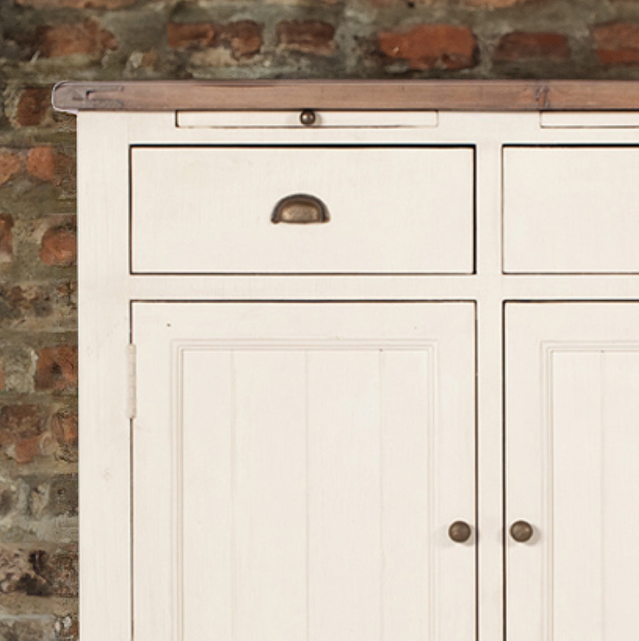 Style and practicality need to go hand in hand sometimes, and they do just that with the stunning Worcester White Wooden Sideboard. This white kitchen sideboard comes with a natural rustic wood top, featuring the marking from its previous use. Whether you have a large kitchen or a small one, it will surely benefit from the addition of a wood sideboard that really stands out from the rest. This sideboard is made entirely from reclaimed wood with a painted white base.